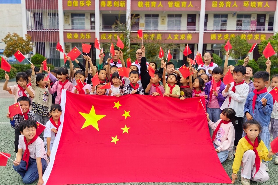10月1日,安徽省阜阳市阜南县于集乡北京律师希望小学关工委携手少先大队组织队员开展“庆国庆,唱国歌,我与国旗合个影〞主题活动在希望小学操场举行。