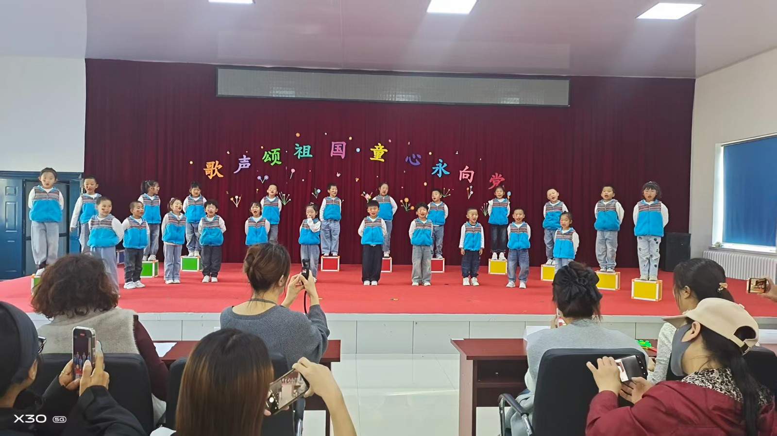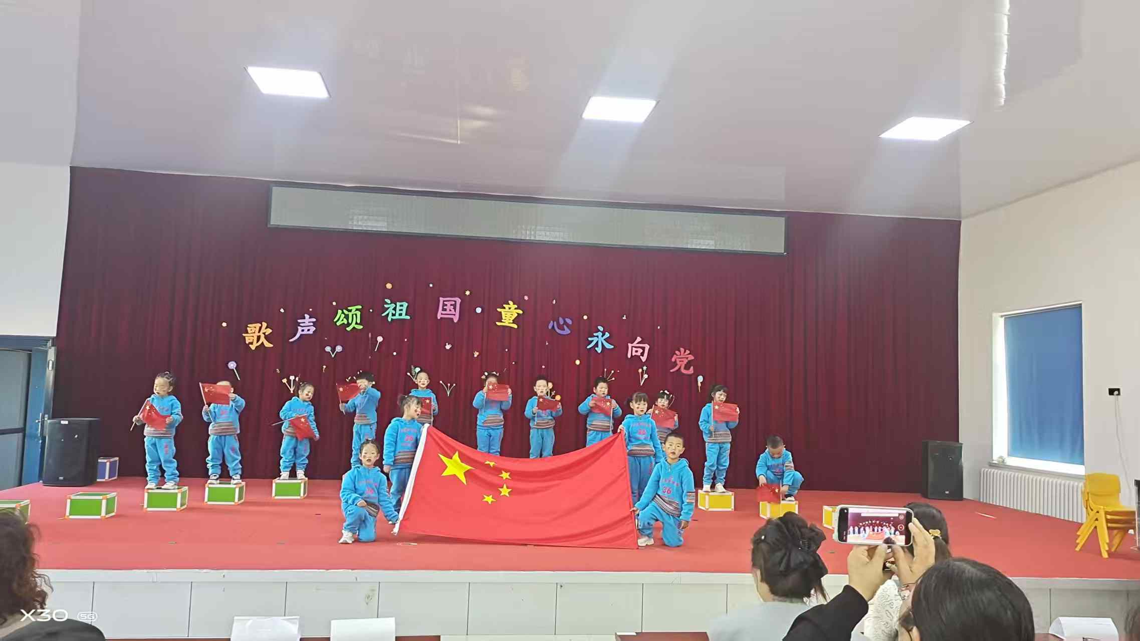 在《歌唱祖国》背景音乐的伴随下拉开红歌会帷幕,孩子们身着统一的服装,自信满满地走上舞台。活动以班级为单位,各班用最纯真的童声唱响《我爱你,中国》《我爱北京天安们》《小星星》《学习雷锋好样样》等一首首红色经典。悠扬的红歌,宛如一颗颗炽热的红色种子,悄然植入孩子们纯真的心灵之中,表达了孩子们对祖国妈妈真挚的祝福和对美好生活的热爱。全体师幼及家长在《国旗国旗真美丽》合唱中把活动把气氛推向高潮。