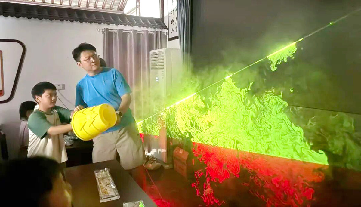 随后,“湍流奥秘”互动实验工坊将活动气氛推向高潮。科技馆辅导员指导孩子们分组合作,利用气球、胶带等简易器材,亲手操作并观察流体从“层流”到“湍流”的转变过程。而气体湍流可视化实验中,一束激光、一团烟雾让看不见的气流漩涡直观呈现,更是引得孩子们惊叹连连,深刻体会到周培源先生毕生钻研的科学问题的趣味与深奥。