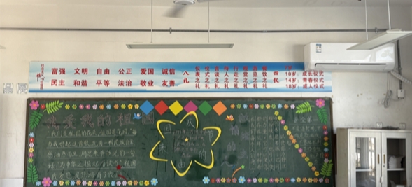 在国防教育月和中华人民共和国成立76周年之际,为营造浓厚的国庆氛围,引导学生厚植爱国情怀,从9月20日至30日,江苏省徐州市铜山区汉王镇北望小学关工委组织各班级同步开展 “庆国庆” 主题黑板报创作与班级文化墙布置活动。全校师生以黑板为画布、以墙面为载体,将对祖国的祝福与热爱融入一幅幅生动作品、一面面特色文化墙中,让红色文化在校园里焕发新的活力,让班级角落成为爱国教育的鲜活阵地。