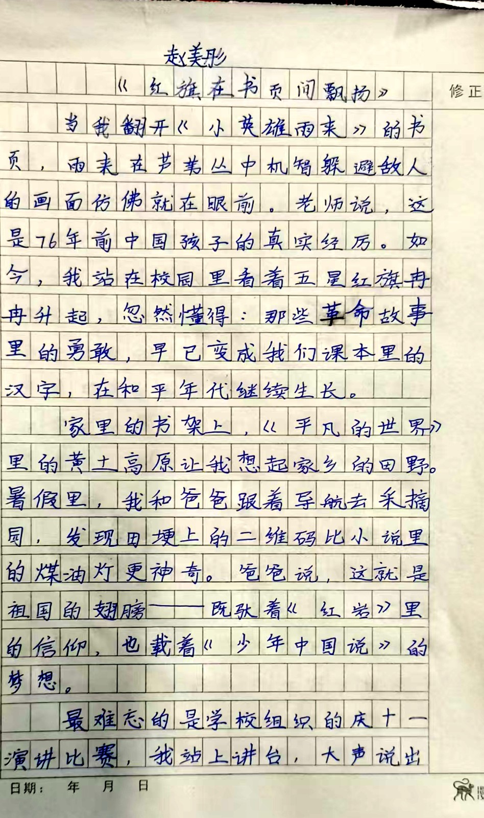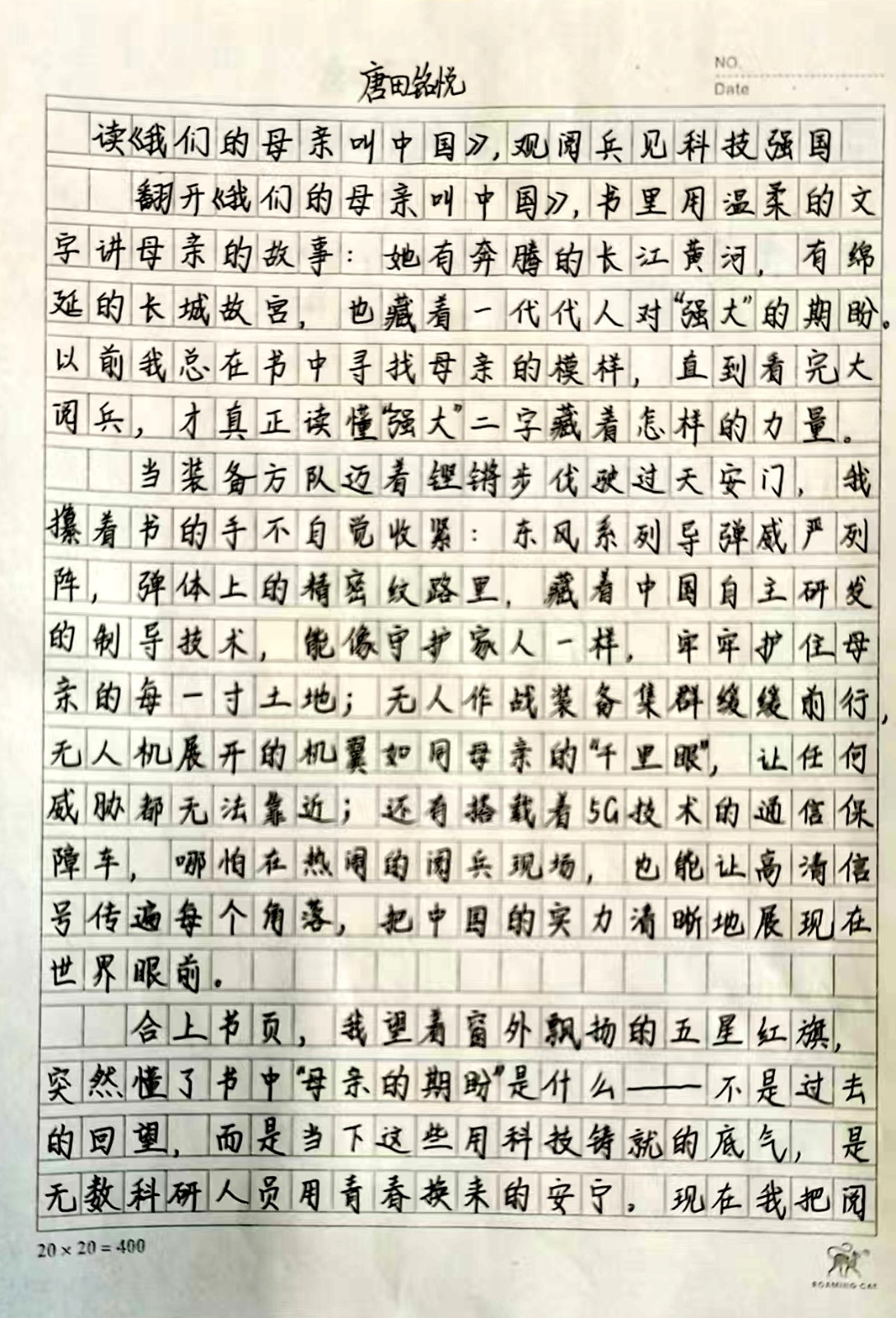 截至目前,学校已通过班会动员、语文课堂指导等形式推进活动落地。学生们踊跃参与,有的以《我们的母亲叫中国》记录街巷里的节日氛围与发展变化,有的结合《盛世中华强国有我》等书籍撰写读后感,用稚嫩却真挚的文字表达对祖国的祝福、对时代的礼赞。