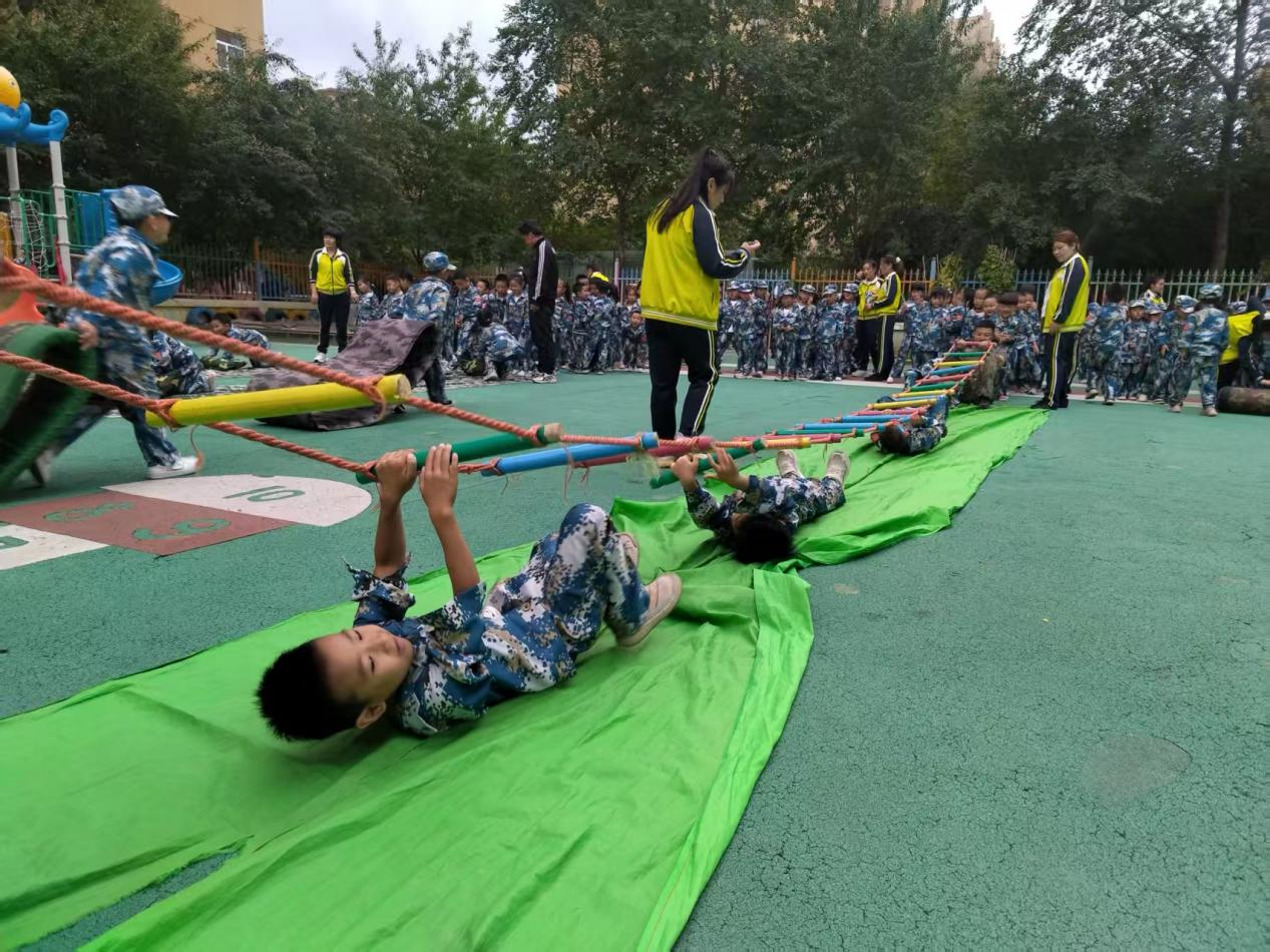 活动现场,孩子们身着迷彩服,昂首挺胸列队等候升旗仪式。在嘹亮的国歌声中,孩子们向五星红旗行注目礼并共唱国歌。在军事训练环节,教官带领孩子们进行“匍匐前进、运送弹药、运送兵源”等军事科目演练,大家互相团结合作,孩子们拼尽全力完成任务,这种不怕困难、不服输的精神着实令人佩服。现场呐喊声、加油声不断,把整个活动推向高潮,迎来外围观众热烈的欢呼声。