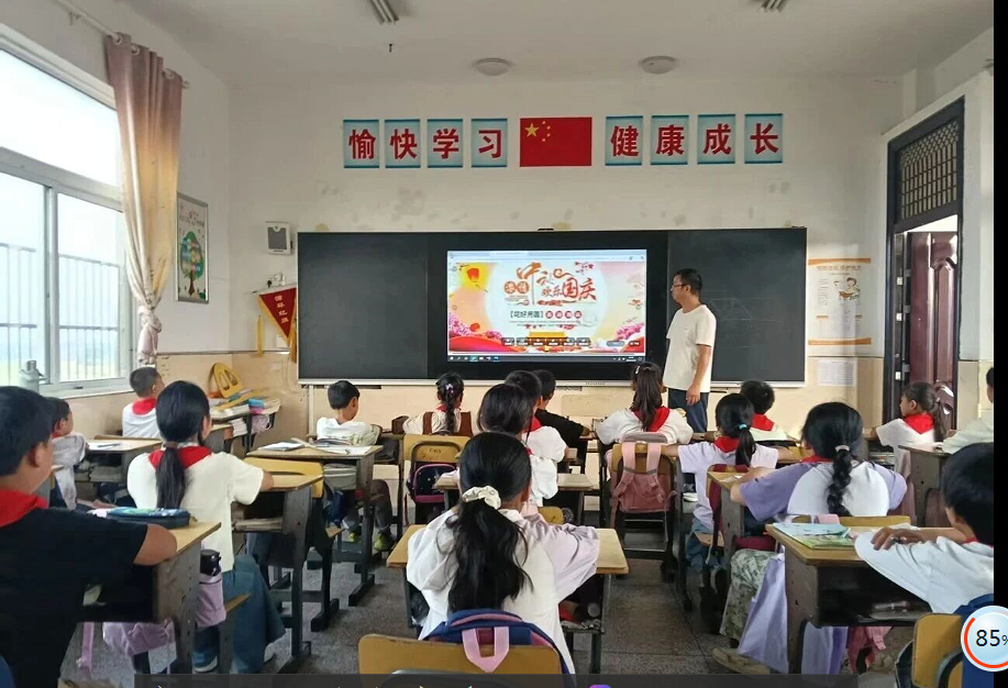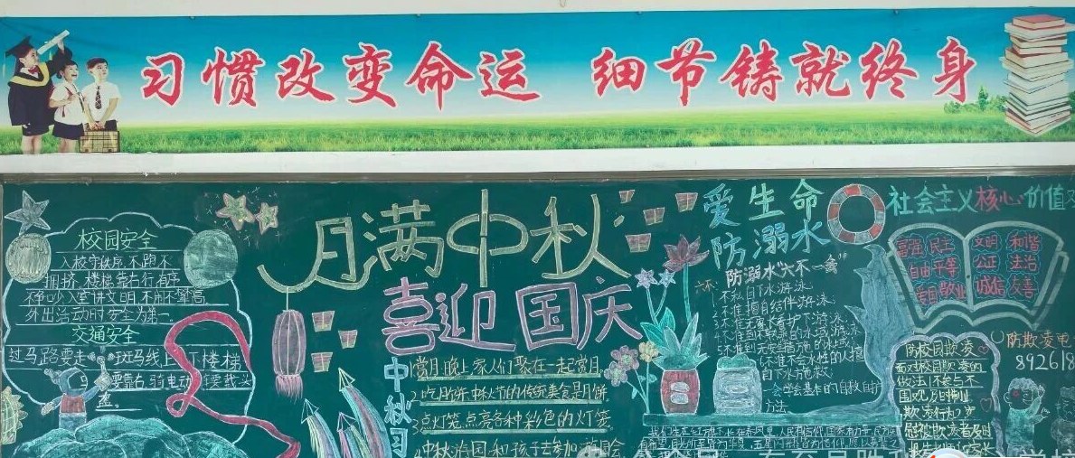 各班积极开展 “共赴明月之约 同贺祖国之诞” 主题班会。老师们通过精心制作的 PPT,生动地讲述了国庆节的由来、意义,以及中秋节的传说和习俗。同时,各班级还组织更新了国庆黑板报。同学们在老师的指导下,用五彩的粉笔在黑板上描绘出对祖国的热爱和对中秋的祝福。黑板报内容丰富,有鲜艳的五星红旗、可爱的玉兔、美丽的嫦娥,还有同学们写下的深情祝福。这些黑板报不仅展示了同学们的艺术才华,更成为校园里一道亮丽的风景线。