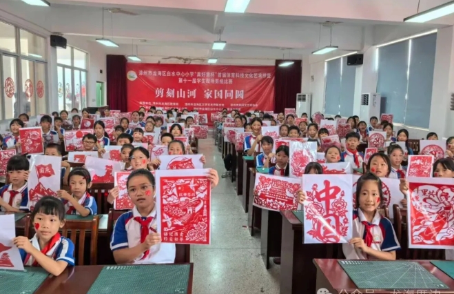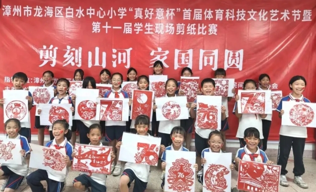 10月9日,龙海区白水中心小学“真好意杯”首届体育科技文化艺术节暨第十一届学生现场剪纸比赛落下帷幕,该中心小学120名小学生和18名幼儿,以剪刀为“画笔”,以红纸为“画布”,将对祖国山河的向往、对阖家团圆的期盼,细细裁刻进每一道纹路里。