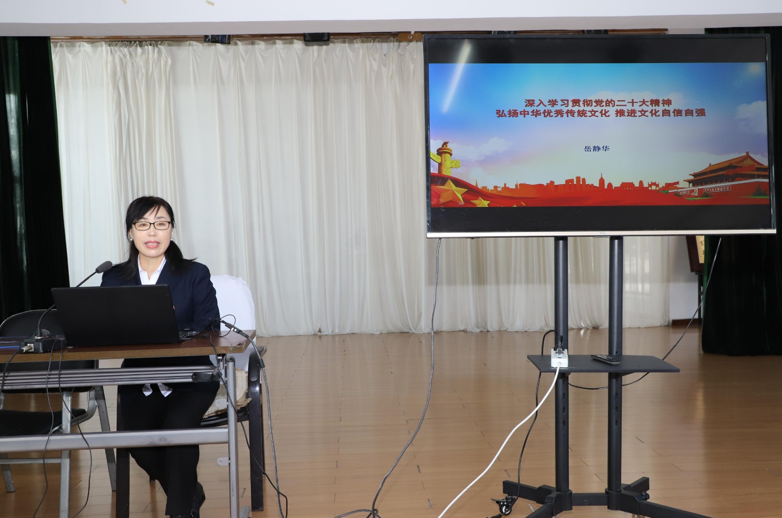 九三分公司“五老”、关工委常务主任岳静华为确保宣讲的质量和效果,把党的二十大精神、《党史学习教育工作条例》《如何预防青少年犯罪》等专题讲座内容写成教案、制作成图文并茂的课件。然后,带领“五老”宣讲团的成员深入到11个农场有限公司和分公司直属单位向干部、职工和青少年进行面对面地宣讲。岳静华主任还在嫩江市九三小学和分公司两所幼儿园为孩子们宣讲毛泽东的故事,特别是毛爷爷小时候爱学习的生动故事,教育引导孩子们从小传承红色基因,树立远大理想,打好成长成才基础。孩子们一边听、一边鼓掌说:“岳奶奶讲得真好,我们非常喜欢听!”在大西江农场有限公司岳静华主任以《弘扬中华优秀传统文化 推进文化自信自强》为专题,为“五老”、青年和职工代表宣讲“中华优秀传统文化是我们民族的‘根’与‘魂’。”她强调:今后,我们要把弘扬中华优秀传统文化,推进文化自信自强同传承红色基因结合起来、同分公司党委提出的打造“文化九三”结合起来、同企业精神文明建设结合起来、同传播正能量讲好中国故事结合起来,用先进的文化凝聚起广大“五老”和青少年奋进新征程的磅礴力量。在红五月农场有限公司机关宣讲《党史学习教育工作条例》时,岳静华主任要求机关干部和青年骨干要在党史学习教育中牢牢把握历史主动,把党史学习教育内化于心、外化于行,以实干担当的精神状态持续涵养党史学习的深度和厚度;要学党史、知党史、用党史,感悟初心使命、激发奋斗动力,勇于担当、善于作为,为实现分公司高质量发展做出贡献。