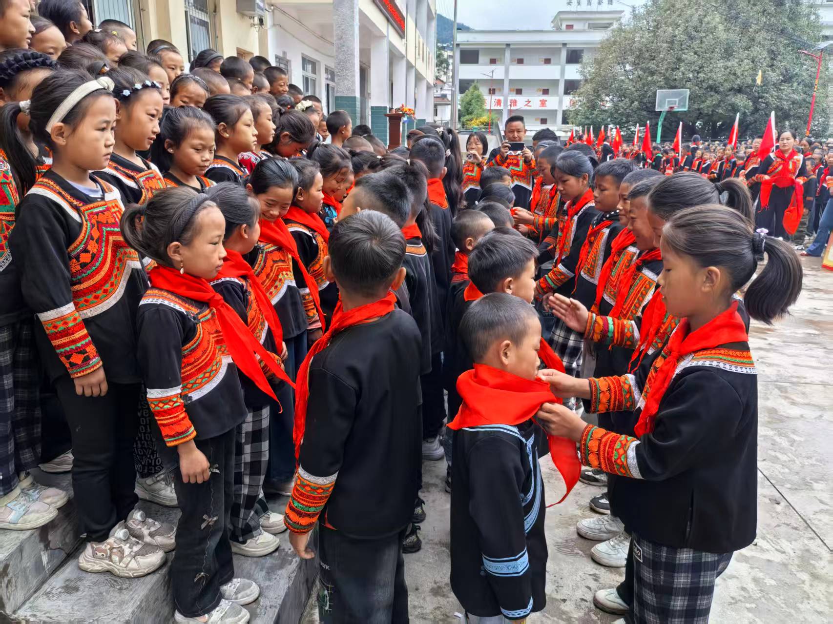 仪式在激昂的《出旗曲》中拉开序幕,旗手们迈着矫健的步伐护送队旗入场,全体人员肃立致敬。县关工委成员与老队员一同为新队员佩戴红领巾,鲜艳的红领巾映衬着孩子们灿烂的笑脸,新队员们纷纷举起右手,向授予者庄严回礼。