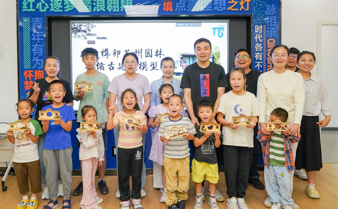 实践环节中,亲子家庭在老师指导下亲手体验苏州园林榫卯工艺,协作拼搭微缩古建筑模型,并发挥创意进行园林造景。从梁柱对接到底座布景,即使是零基础参与者,也能在动手过程中感受到传统工艺的精妙,让古老非遗在指尖换发新生。活动不仅锻炼了孩子们的空间思维与动手能力,更在亲子默契配合中加深了彼此的情感联结。
