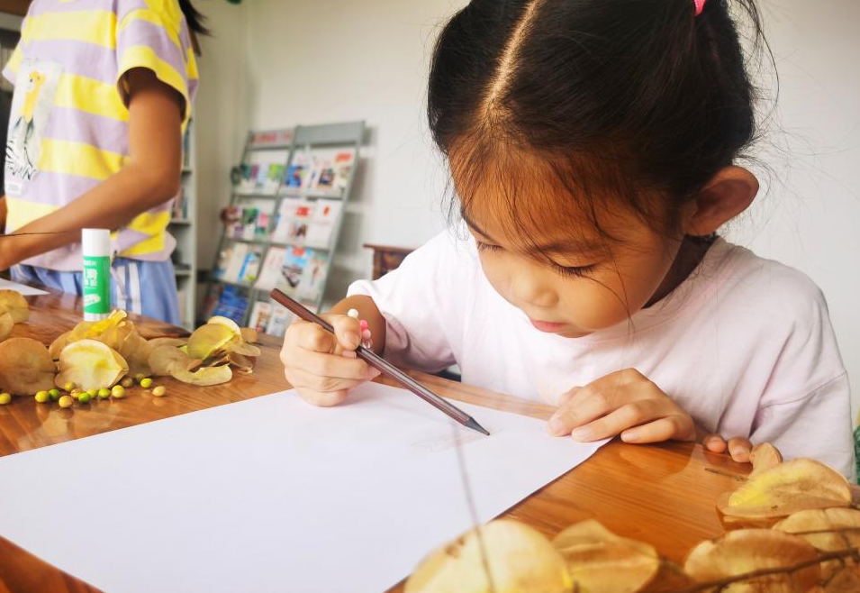 随后的手工制作环节推高活动氛围。志愿者为孩子们分发新鲜树叶、白纸、彩铅等材料,指导大家发挥想象,将树叶拼贴成小鱼、蝴蝶、小船等造型,再用彩铅勾勒细节、填色。孩子们热情高涨,有的专注裁树叶,有的认真涂颜色,不一会儿,一幅幅 “自然创意画” 新鲜出炉。学生梅萍海举着作品说:“我要把这幅画贴在家里,提醒爸爸妈妈爱护树木。”