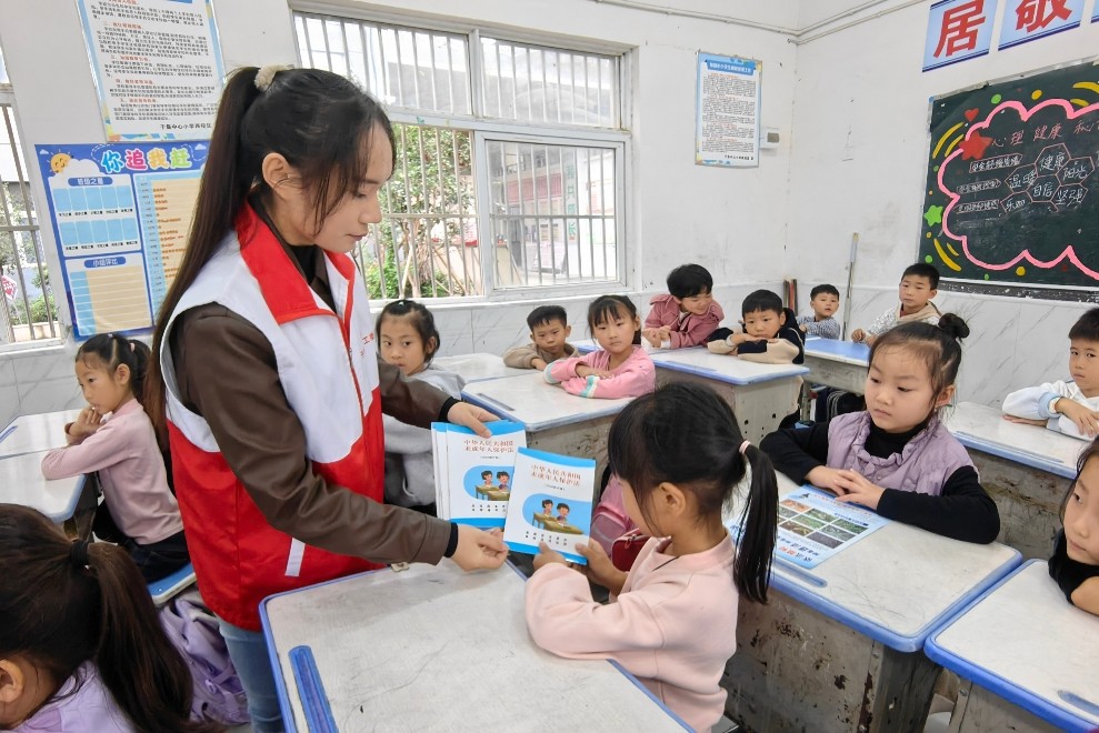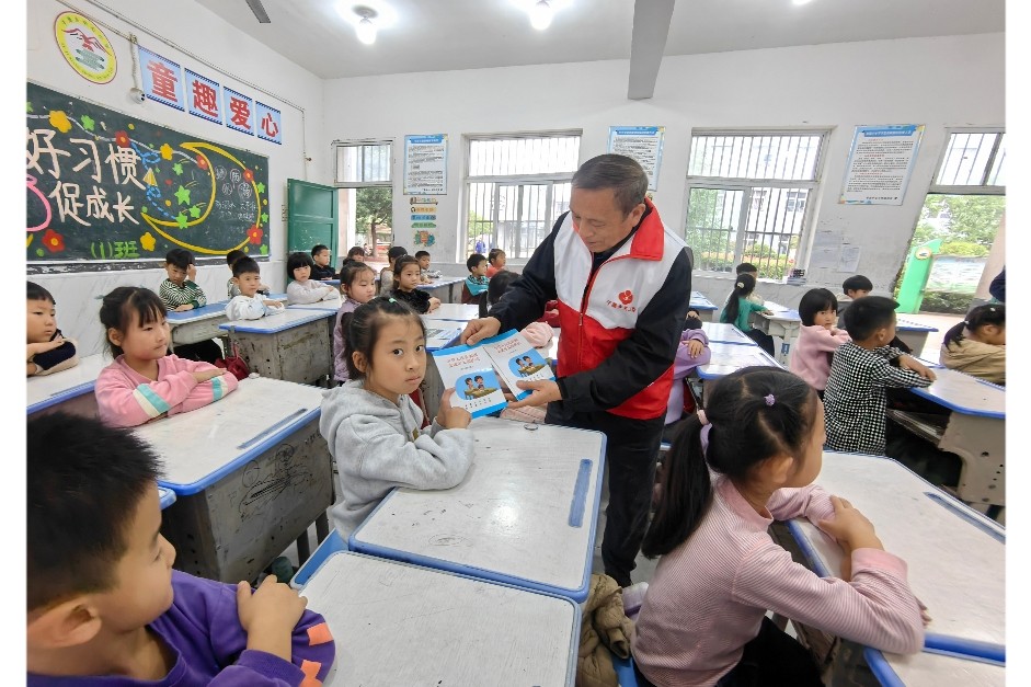 活动中,关工委志愿者向学生发放了《中华人民共和国未成年人保护法》手册和宣传单,向同学们解读了未所年人保护法条例,重点解读校园欺凌等方面条例,结合日常生活中的实际案例,讲解未成年人保护常识,从家庭到社会,从校内到校外等方面多角度宣传教育未成年人保护法,重点强调父母及监护人应当依法履行的监护职责,提高未成年人自我保护意识和能力,教育引导孩子们学会学法用法,学会运用法律武器维护自身合法权益,保护自己健康成长。
