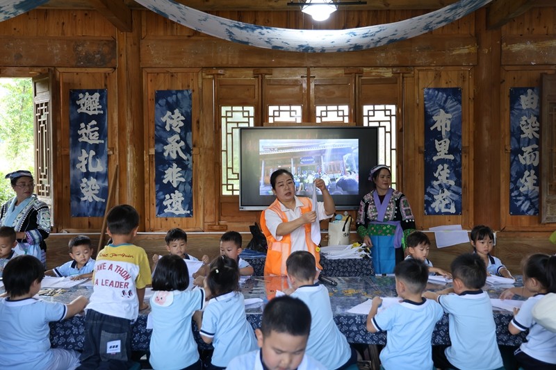 接着,老师又带着孩子们体验了非遗项目。孩子们在老师的带领下,体验巧手蜡染,家长与孩子共同创作,感受蓝白相间的传统艺术魅力。并体验了石磨酸汤豆腐、打制糍粑、制作中式面点的全过程,从原料到美食,体会古法工艺的匠心独运。这些活动不仅让孩子们在玩中学、在做中悟,更在他们心中播下了热爱家乡、传承文化的种子,极大地增强了文化认同感与自豪感。