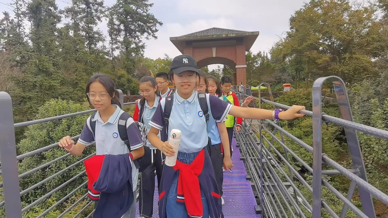 连接游乐园区和生态园区的是220米长的梯形吊桥,高低落差20米,人行桥晃,拾级而上。同学们全身心地投入其中,意念上想象着红军长征的勇往直前和团结一致。他们相互鼓励,相互扶持,共同克服了前进道路上的艰难险阻,到达生态园悦赏繁花似锦的无限风光。