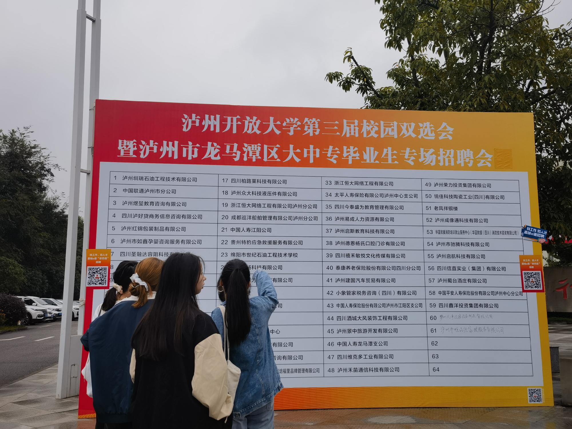 为深入落实就业优先战略,切实解决大中专毕业生就业难题,10月19日,泸州市龙马潭区关工委联合泸州开放大学、龙马潭区人力资源和社会保障局、龙马潭区就业服务管理局,在泸州开放大学行知广场共同主办第三届校园双选会暨龙马潭区大中专毕业生专场招聘会,为毕业生打通就业“绿色通道”,切实缓解就业压力。