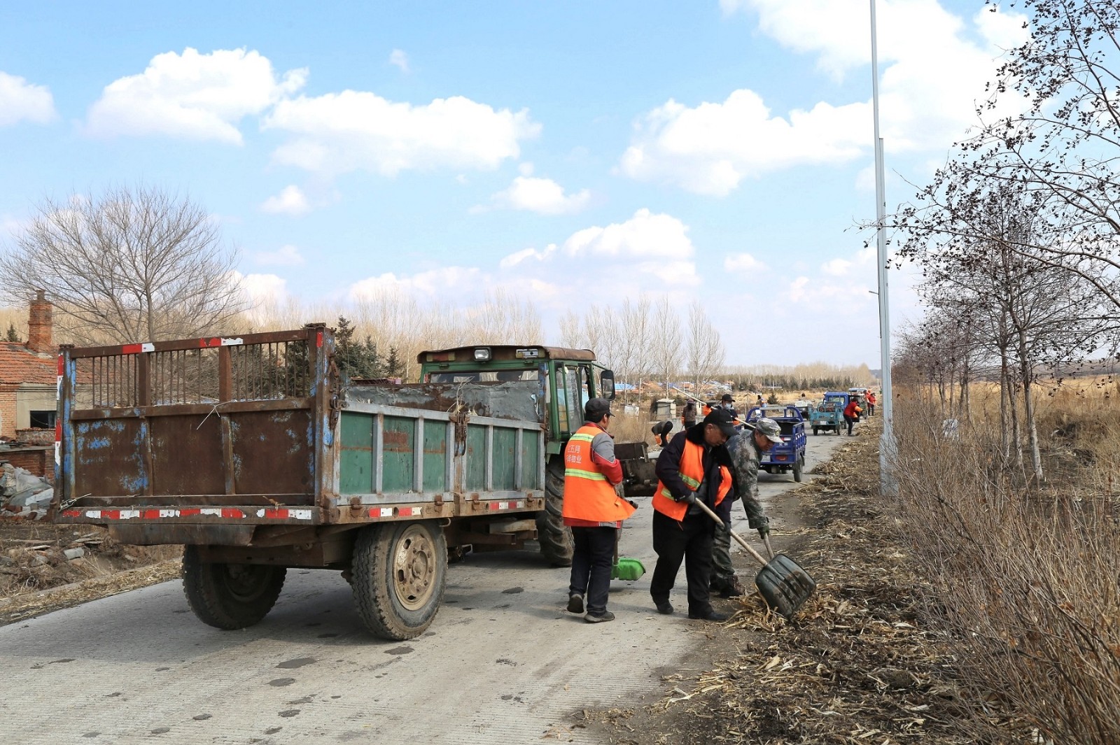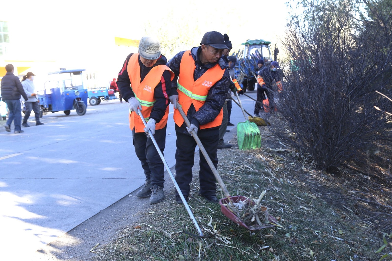 清理现场,“五老”志愿者们手持扫帚、耙子、铁锹等工具分区作业。他们齐心协力将落叶与垃圾归拢成堆,确保不留死角;另一组“五老”志愿者紧随其后,将归拢的杂物打包、转运,迅速装车清运。农场居民看着清理后的整洁街道,都笑着说:“大家一起动手清理,场区环境变得更好了,住着也更加舒坦了。农场关工委把环境整治当大事办,咱们居民也得跟上,一起把这份整洁守住!”