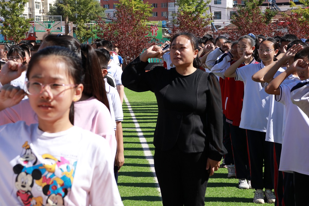 第四项:集体宣誓。全体师生高举右拳,目光坚定,齐声宣誓:“铭记历史,勿忘国耻;勤奋学习,强我中华;严守纪律,不负韶华!”铿锵有力的誓言回荡在校园,不仅是对历史的承诺,更是对未来的期许,展现了我校师生奋进向上的精神风貌。