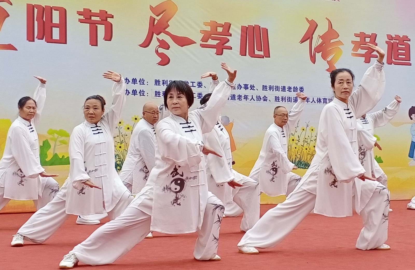 接着,活动进入文艺汇演的热闹场面,胜利街道各村、社区、单位的老年文艺选手排练的让群众喜闻乐见的文艺节目陆续登台亮相。演出内容包括传统文化篇、爱国情怀篇和养生健康篇等三大篇章,共22个节目。一首舞蹈《奋进新时代》登台演出拉开了序幕,接着,胜利街道老年文艺队自编自演的情景剧《百善孝为先》节目激起了场上掌声不断。活动的最后,全体演职人员和相关领导登上舞台,手挥小红旗共同大合唱《我和我的祖国》,活动在热烈的气氛中落下帷幕。