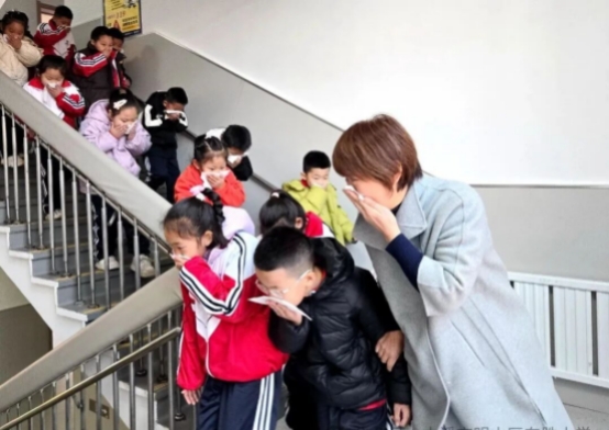 随着校园内模拟火警信号响起,演练正式开始。老师迅速组织学生弯腰、低头,用湿毛巾或衣物捂住口鼻,按照预定路线快速、有序向安全区域疏散;楼层引导教师在楼梯口、转角处值守,及时疏导人流,防止拥挤摔倒;校领导全程巡查,实时把控各环节进度。