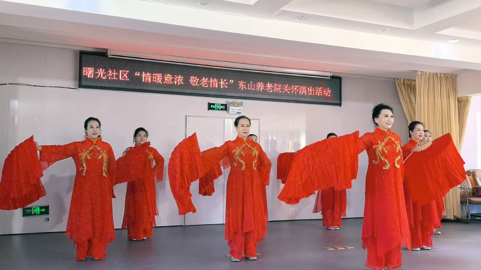 演出现场,来自曙光社区的各民族歌舞团为老人们带来了民族舞蹈《各族儿女心连心》、《春到雪山》等节目,展现多民族文化魅力,婀娜的舞姿赢得了现场老人们的阵阵掌声;最后,由社工带来的《党旗映初心 曙光暖夕阳》主题演讲将活动氛围带入高潮,看着台上的精彩表演,不少行动不便的老人们,脸上露出了笑容,轻声合着台上的旋律,眼里闪烁着激动的泪光。