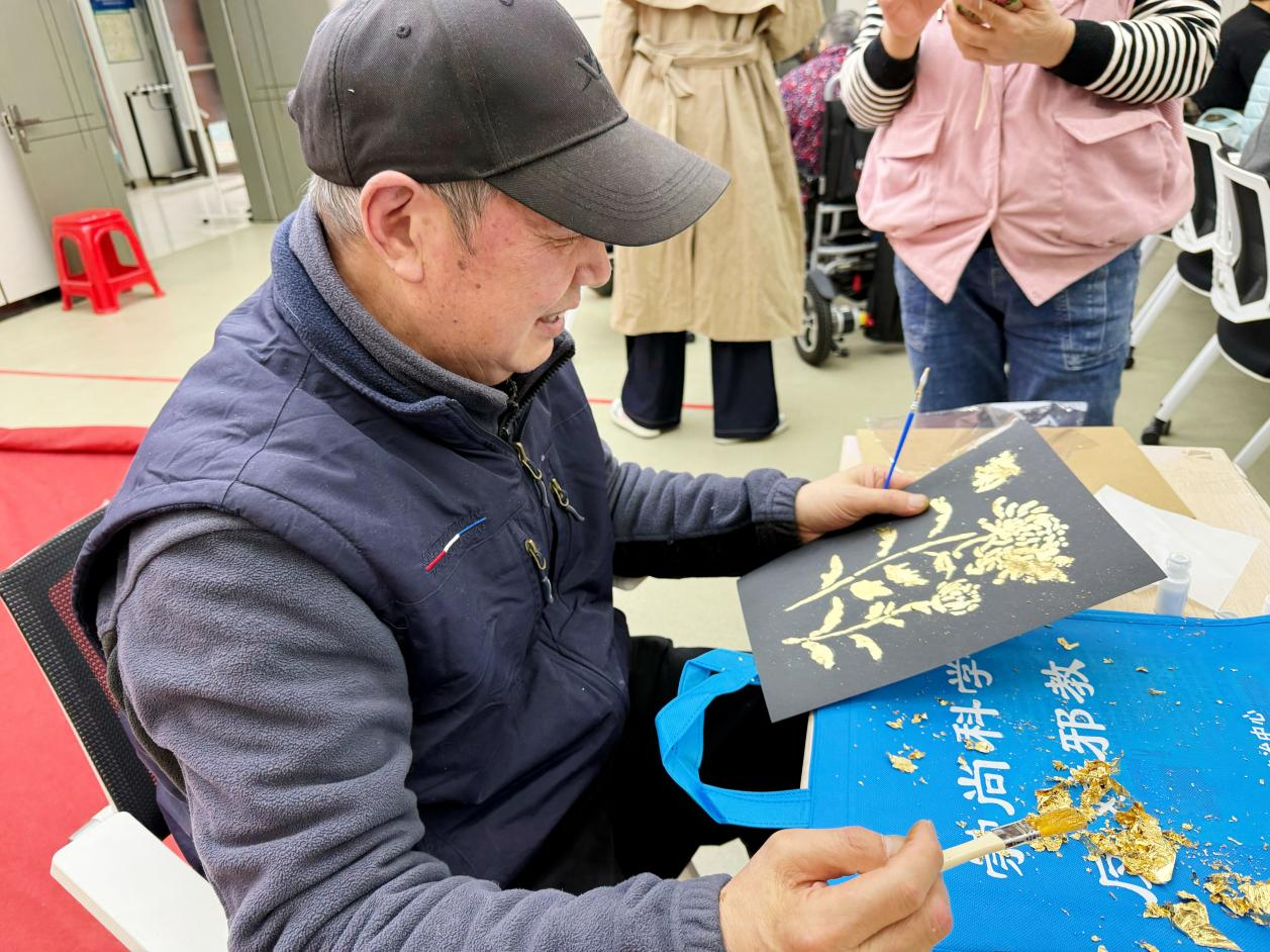 活动首先进行的是“巧手溢彩,箔映重阳”非遗体验环节,在专业老师的耐心讲解和指导下,大家纷纷化身“手工匠人”,投入到这场与千年非遗文化的对话中。他们小心翼翼地拿起一片片薄如蝉翼、金光熠熠的金属箔片,用特制的工具在画板上细心勾勒、粘贴。一时间,活动现场静谧而专注,只听见箔片剥离的细微声响,当一幅幅金光灿灿、独具匠心的箔画作品在手中诞生时,老人们的脸上无不洋溢着孩童般自豪与喜悦的笑容。李阿姨捧着自己的作品爱不释手,高兴地说:“没想到我这双做惯了家务的手,也能做出这么精美的艺术品,真是太有成就感了!”