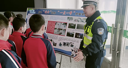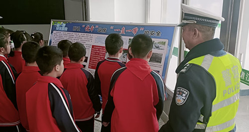 宣传活动中,交警带着学生们参观图文结合的交通安全主题展板,让学生了解“一盔一带”的重要性、交通违法行为的危害性,让学生们了解不同场景下的安全防护要点。