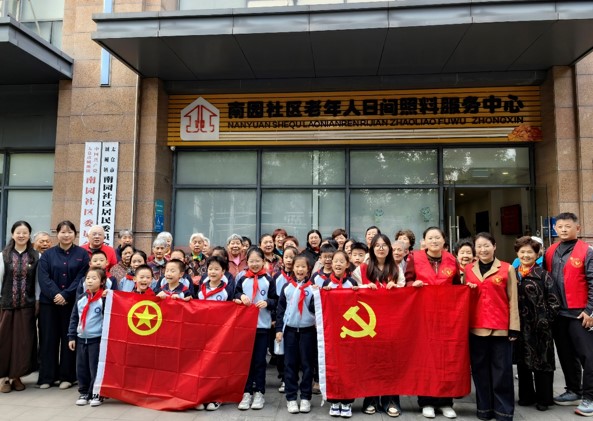 活动尾声,全体师生与老人们在服务中心门口合影。镜头前,孩子们的笑脸明媚,老人们的笑容慈祥,团旗、党旗在秋风中猎猎作响,仿佛在见证这场跨越 generations 的温情对话。