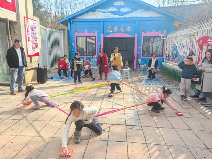 本次活动的流程与规则,孩子们迅速组队、整装待发,脸上满是期待,迫不及待地投入到趣味游戏当中。“蒙眼海绵棒对战”环节率先拉开活动序幕。蒙眼的孩子原地转完圈后,凭借听觉捕捉方向、依靠反应挥舞海绵棒,防守方则在划定的安全区内灵活躲闪、巧妙周旋。现场笑声、呐喊声、加油声此起彼伏,孩子们在趣味对抗中,不仅锻炼了肢体协调能力与应急反应能力,更收获了纯粹的快乐。“夹板接力赛”环节兼具温情与规则感,孩子们分组参与、默契接力,双腿夹住软夹板同步前行,严格遵守“膝盖交接、掉落重来”的规则,在一步步协作前行中,既锤炼了坚持到底的毅力,也深刻体会到默契配合的重要性。家长们在一旁全程驻足,不时加油鼓劲,温暖的陪伴让整个活动现场暖意融融、温情满溢。“东南西北跑”环节将活动氛围推向高潮。孩子们小手拉紧彩虹拉力圈,凝神倾听裁判指令,一声令下便冲向指定方向抢夺属于自己方向的玩具,最先拿到玩具的孩子即为获胜者。大家全力以赴、奋勇争先,在奔跑中感受运动的乐趣,充分展现了社区儿童的活力与爆发力。本次“社会实践活动月”为期1个月,从2026年1月27-2月28日结束,以免费公益形式,能够提供课业辅导、趣味活动、动手实践等互动课程服务,充分依托社区儿童之家活动阵地,把社区儿童凝聚在社区儿童之家周围,用实际行动践行和护航守护孩子健康成长,让儿童之家成为孩子成长的“第二个家”。