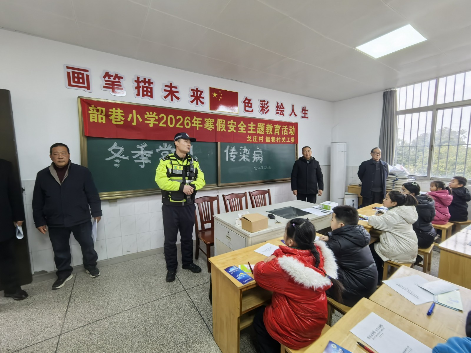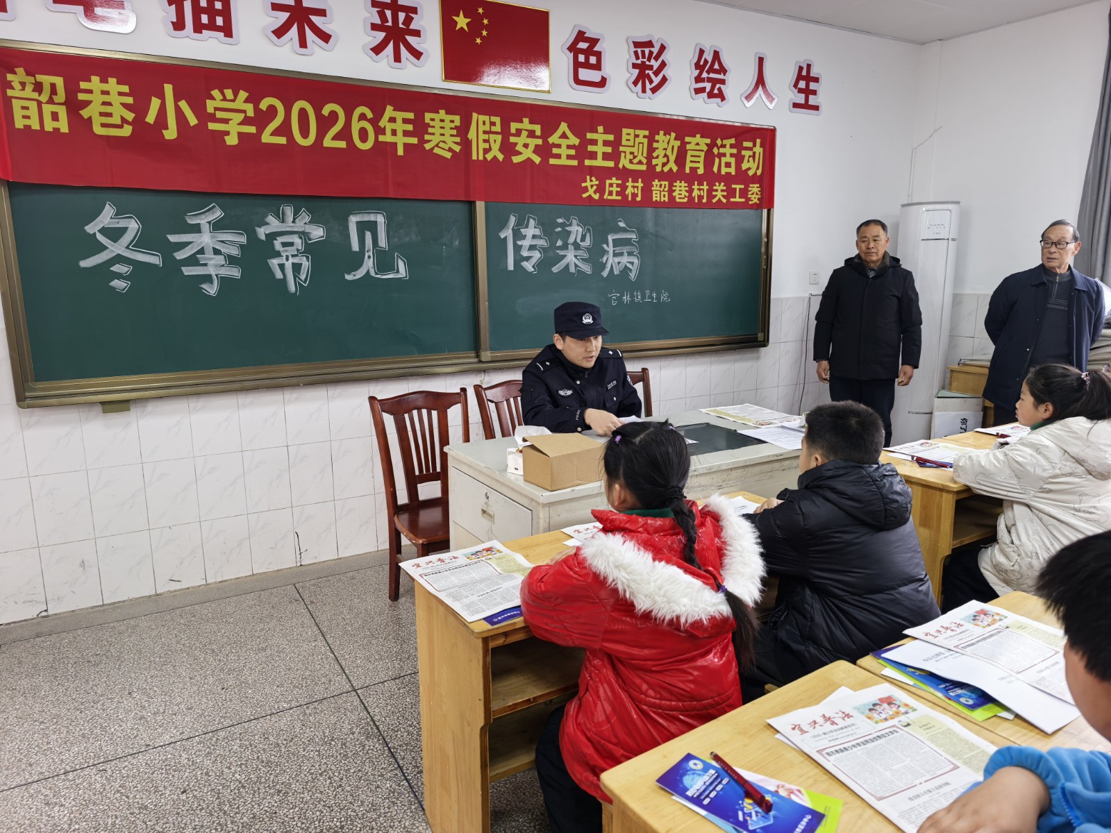 2月5日,江苏省宜兴市官林镇韶巷村关工委、戈庄村关工委利用宜兴市丰义小学韶巷办班点休业式的有利时机,联合官林派出所关工站、官林交警中队关工站、官林镇卫生院防保所等相关单位开展未成年人安全法治健康知识宣教活动,50多名小学生参加了活动。