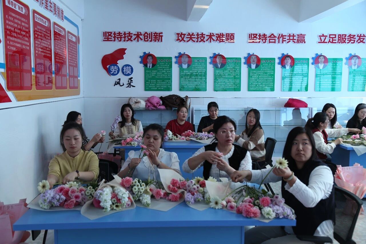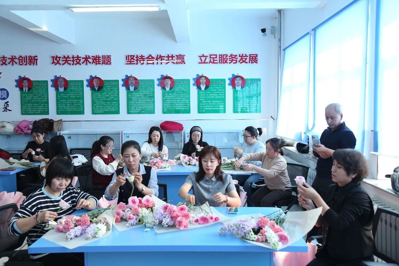 活动特邀专业花艺师现场授课,围绕花材识别、色彩搭配、造型构图、修剪技巧与花语寓意进行细致讲解,并分步演示插花流程。在老师的指导下,青年女职工们化身花艺师,精心挑选玫瑰、康乃馨、洋桔梗等花材,修枝剪叶、错落搭配,将零散花枝创作成一件件独具匠心的花艺作品。现场花香四溢、笑语盈盈,大家交流心得、展示成果、合影留念,在动手创作中舒缓压力、陶冶情操。