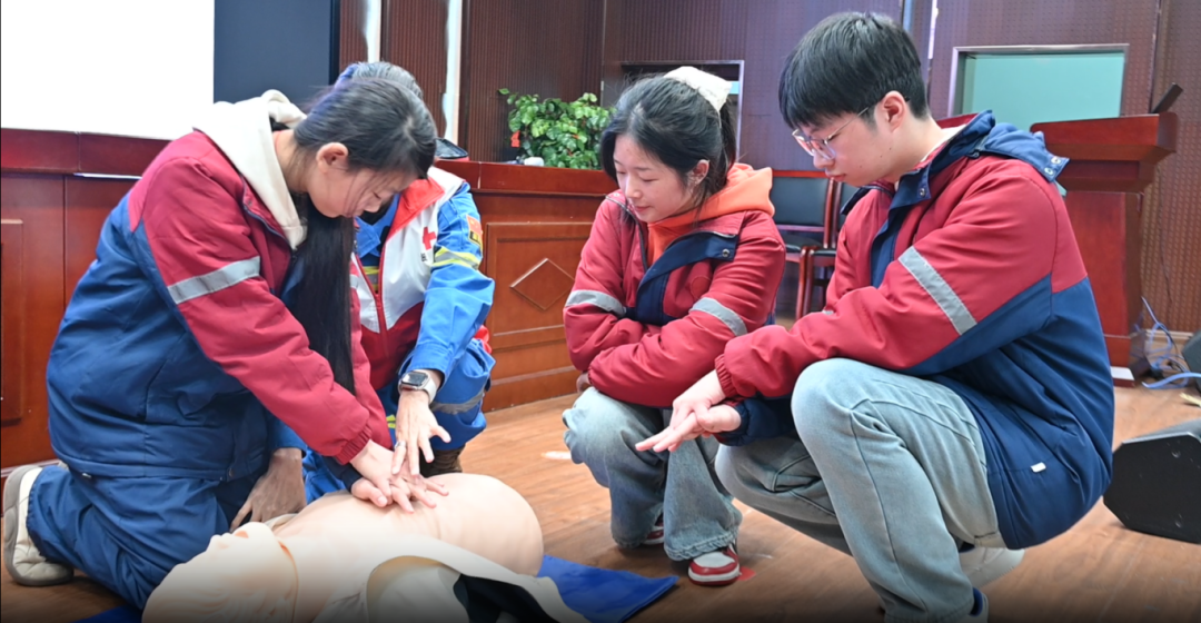 为了让知识不仅“入耳”更“入心”,讲师在进行理论知识讲解时与同学们开展问答互动,一个个问题抛出,同学们争先恐后举手回答,现场秒变“抢答赛场”。为鼓励大家,讲师还为踊跃参与的同学们发放一份急救包作为小礼品。随后在讲师的“手把手”指导下,同学们分组进行实操,在模拟人上认真练习胸外按压与人工呼吸,亲自操作AED训练机,将课堂知识转化为实际操作能力。虽然只是模拟演练,但同学们认真的神情和标准的动作,俨然一副“专业救护员”的模样。