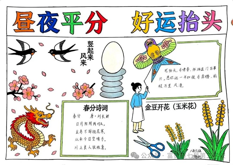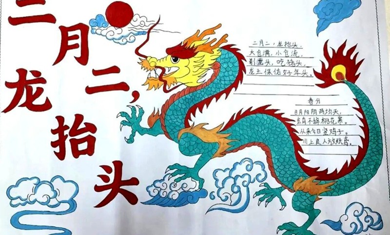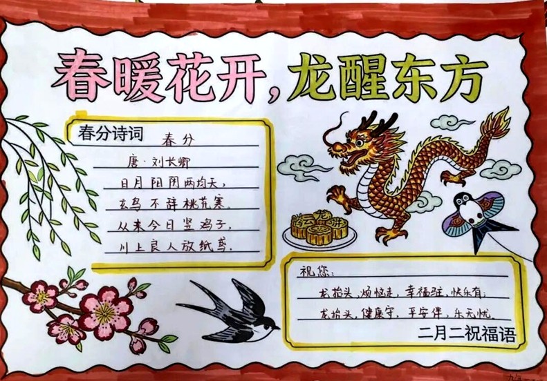春分,是二十四节气之一,这一天昼夜平分、寒暑均衡。民间自古有许多趣味习俗:“春分到,蛋儿俏”,人们尝试把鸡蛋竖起来,寓意平安吉祥、好运降临;春风和煦,正是踏青放风筝的好时节,放飞希望,放飞梦想;桃花盛开,燕子归来,处处生机勃勃;还有吃春菜、祭地神的习俗,祈求风调雨顺、平安顺遂。二月二龙抬头是中国重要的传统民俗日,象征龙行大运、万物苏醒。民间习俗寓意深远:理发剪去旧发,称为“剃龙头”,寓意辞旧迎新、鸿运当头;炒玉米花象征“金豆开花,龙王升天”,祈求风调雨顺、五谷丰登;舞龙祈福,龙腾盛世,寓意奋发向上、前程似锦;吃龙食,祈愿新的一年顺顺利利、平安健康。当着这两个日子巧遇一天,北大荒集团七星第二学校关工委组织开展“春分遇龙头,巧手绘春光”手抄报活动 。