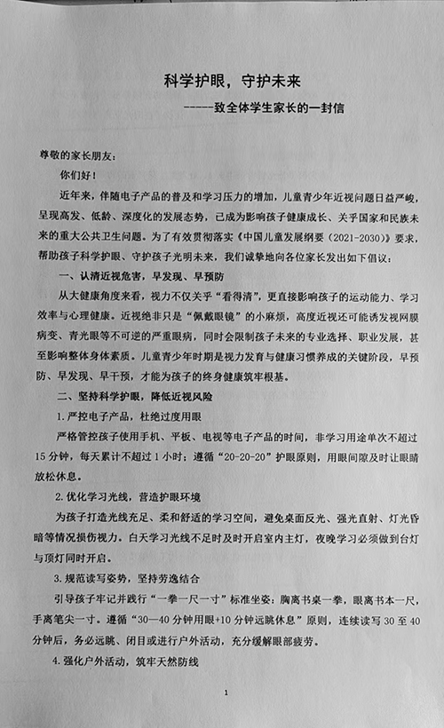 青少年近视防控是一项长期系统工程,家庭是第一责任阵地,学校是核心支撑,社会是重要保障。倡议呼吁广大家长以身作则,主动减少自身电子产品使用时间,多陪伴孩子开展户外互动,积极学习科学护眼知识,主动配合学校做好校外用眼监管工作,实现家校同频、同向发力,把近视防控举措落到细处、实处。