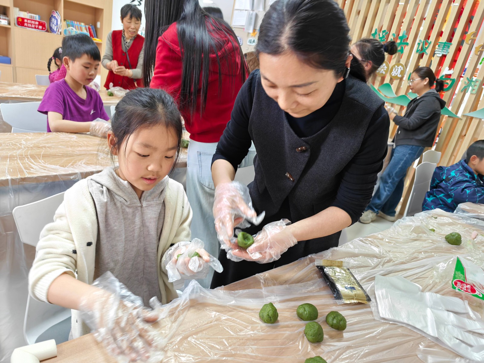 活动开始前,工作人员先为孩子们播放了一段清明节介绍的视频,帮助孩子们了解清明节的知识。随后,活动进入了孩子们最为期待的制作青团环节。青团作为清明节的传统时令美食,承载着深厚的文化记忆。在工作人员的指导下,孩子们洗净双手,跃跃欲试。揉面、包馅、搓圆……大家一边动手操作,一边交流着关于清明节的习俗。工作人员耐心地讲解青团的来历和制作技巧,现场欢声笑语不断。不一会儿,一个个碧绿圆润、散发着艾草清香的青团便在孩子们的手中诞生了。看着自己亲手制作的劳动成果,孩子们的脸上洋溢着自豪与喜悦。
