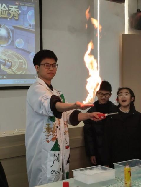 活动中,瓯海区科学教育指导中心陈孺老师带领孩子们开展了一系列趣味实验:车轮陀螺揭示重心与惯性原理,马德堡半球让孩子们亲身感受大气压强的强大力量,而“火焰掌”更是将现场气氛推向高潮——老师利用安全泡沫和水的隔热原理,让火焰在掌心跃动而毫无损伤,孩子们在惊呼中理解了热传导与安全常识。此外,悬浮魔法泡泡、空气大炮、人体导电灯等实验,也让抽象的科学原理变得触手可及。每个实验都遵循“讲解原理—动手操作—互动体验”的流程,孩子们在玩中学、学中乐,既收获了知识,也体验了科学创造带来的成就感。