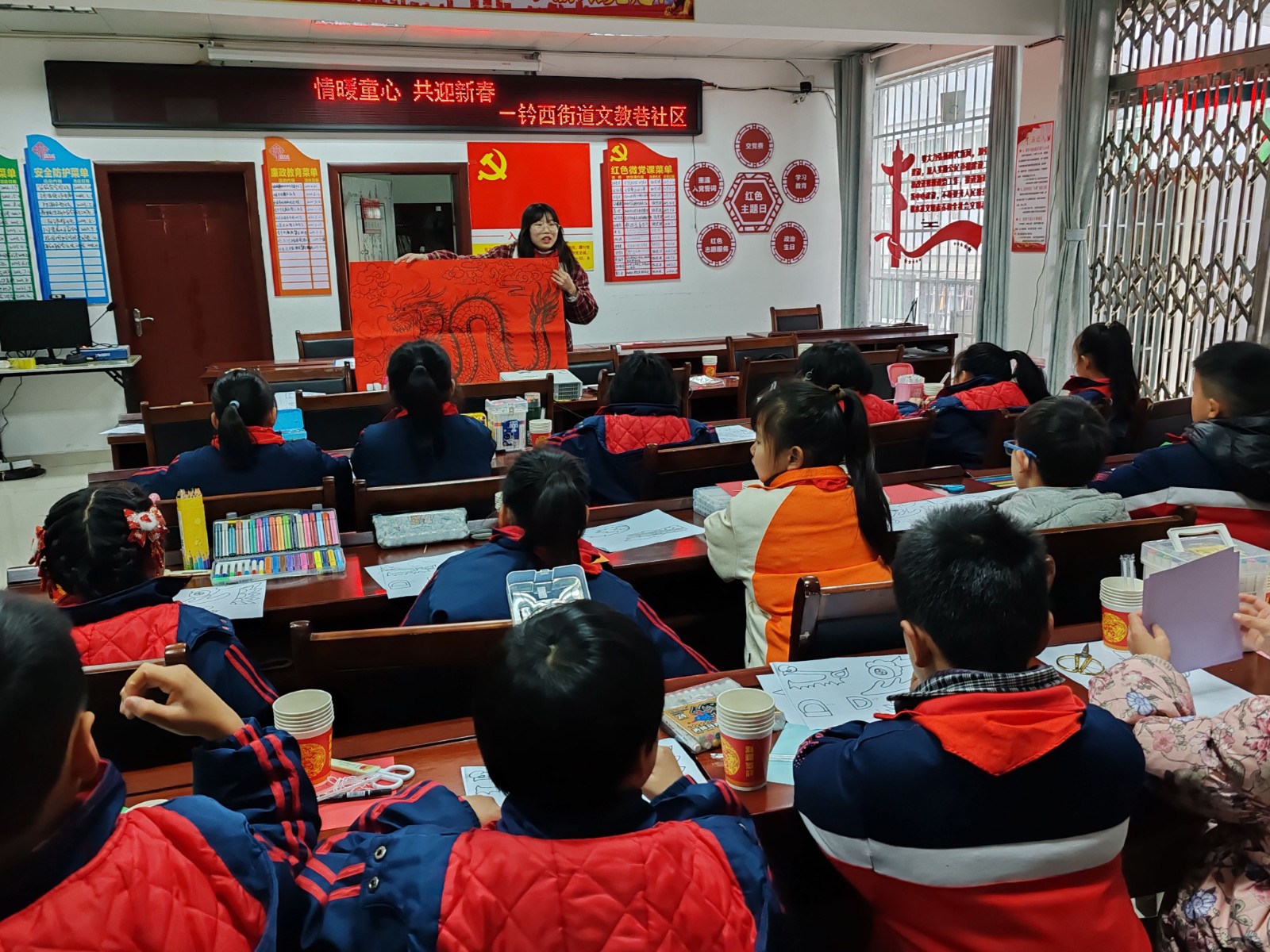 志愿者向孩子们普及了有关龙的传说,教孩子们怎样制作手工龙并详细讲解了制作方法。孩子们用自己的小巧手,一笔一画、认认真真地绘制龙头和龙尾,发挥创造力和想象力,将各式的舞龙栩栩如生地展现了出来。