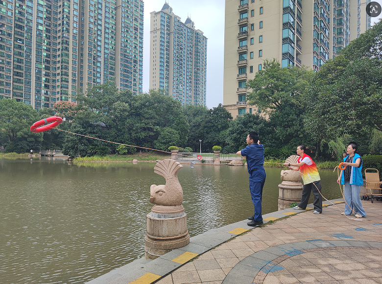 最先到达现场的志愿者按照培训内容,第一时间拨打110、119和120报警电话,并准确报告事发位置和现场情况。随后,公安、消防等救援人员赶赴现场,利用人工湖周围配备的绳索等工具对远离湖边的溺水者实施救援,成功将"溺水者"拉到岸边。