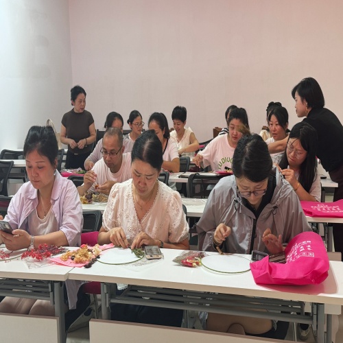 团扇起源于中国,是一种圆形有柄的扇子,象征了团圆美满之意,是中国传统手工艺品。活动开始,志愿者老师为大家介绍制作干花团扇的原料和工具,详细讲解团扇的制作步骤,从专业的角度教导大家如何运用干花装饰团扇,传授使用胶水黏贴干花的技巧。在老师的讲解下,大家充分发挥自己的创造力和想象力,用干花在团扇上搭配出各种图案,并用胶水小心地粘住,以此固定好干花在团扇中的位置。活动现场居民热情高涨,现场充满了欢快的气息,大家匠心独具,每个人都制作了独具特色的高颜值团扇。