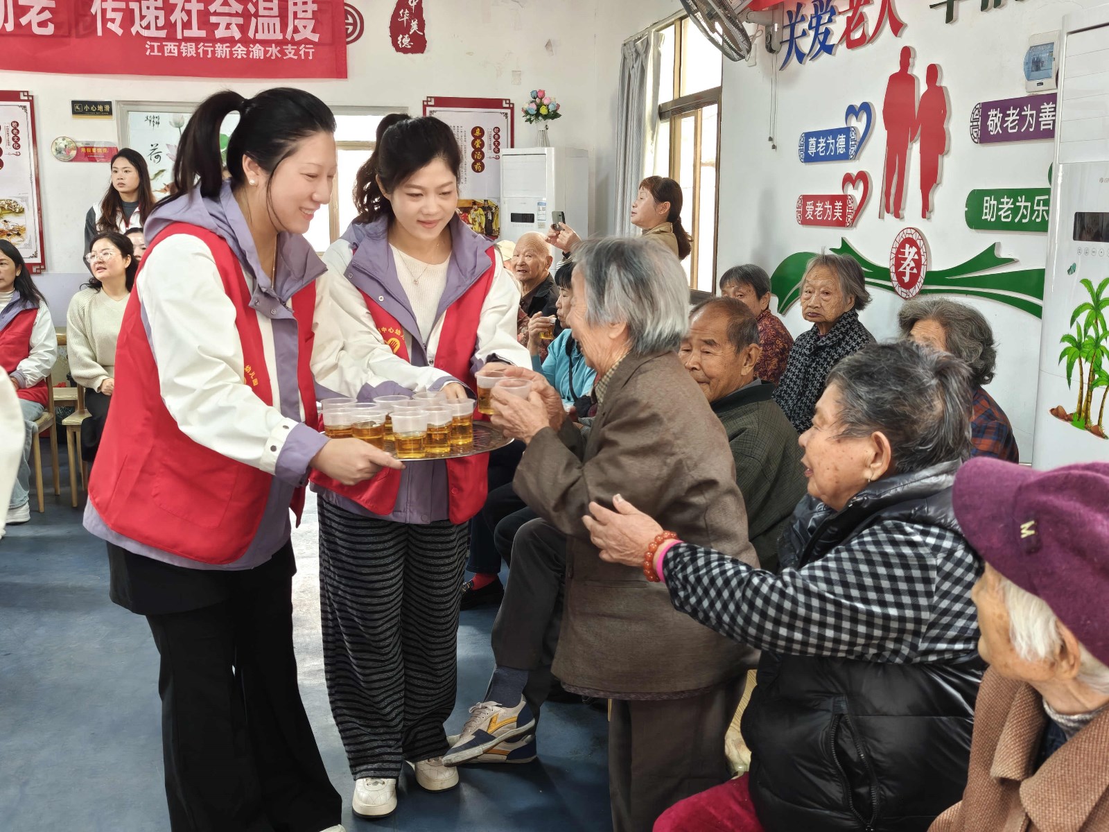 活动现场,志愿者们为老人们精心准备了丰富多彩的暖心服务。在中药香包制作区,志愿者们手把手教老人制作艾叶香包,用通俗易懂的语言讲解养生功效;养生茶歇区飘散着枸杞红枣茶的清香,搭配着软糯的饺子,满足老人们的饮食需求。最热闹的是文艺互动环节,红歌合唱《映山红》引发全场共鸣,孩子们活泼的啦啦操表演更是逗得老人们开怀大笑。