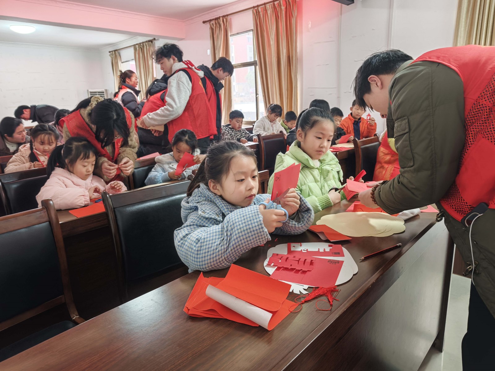 为迎接新年到来,丰富社区儿童假期生活,1月29日,江西省新余市渝水区城北街道钟家山社区关工委开展“巧手剪窗花,笑语迎新年”剪纸主题活动,吸引了社区内十余组家庭热情参与。活动现场社区工作人员为孩子们介绍了剪纸艺术的起源、发展与美好寓意,激发了小朋友们对这项传统技艺的兴趣。随后进入动手实践环节,在志愿者和家长的悉心指导与协助下,孩子们手持安全剪刀,充分发挥想象力与创造力,认真专注地折叠、勾画、裁剪。一张张普通的红纸,在孩子们灵巧的小手中,逐渐变幻出栩栩如生的生肖图案、寓意吉祥的窗花以及各色美丽花卉。活动现场欢声笑语不断,洋溢着浓浓的喜庆氛围和亲子互动的温情。