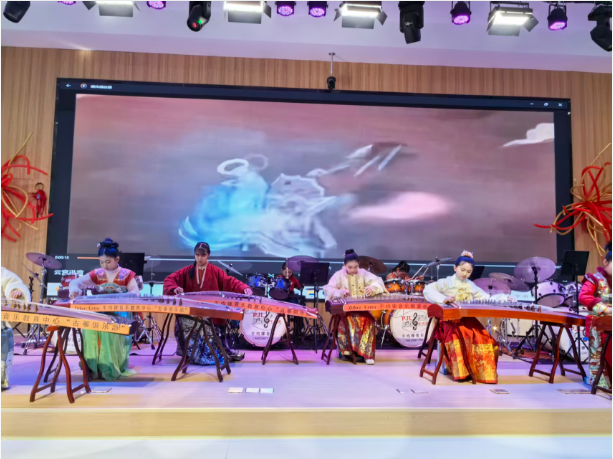 经典红歌与传统民乐交相辉映,奏响了辞旧迎新的华彩乐章。阜南县关工委红歌嘹亮艺术团的成员们精神矍铄,以饱含深情的演唱演绎了《南泥湾》《浏阳河》等脍炙人口的经典曲目,熟悉的旋律穿越岁月长河,唤醒了现场老人们的青春记忆,引发阵阵情感共鸣。架子鼓的激昂节奏与古筝的悠扬曲调完美碰撞,少年乐手们表演的《云宫迅音》《金蛇狂舞》等节目将传统韵味与潮流元素巧妙融合,尽显了新时代少年的蓬勃朝气,表演不时赢得雷鸣般的掌声。
