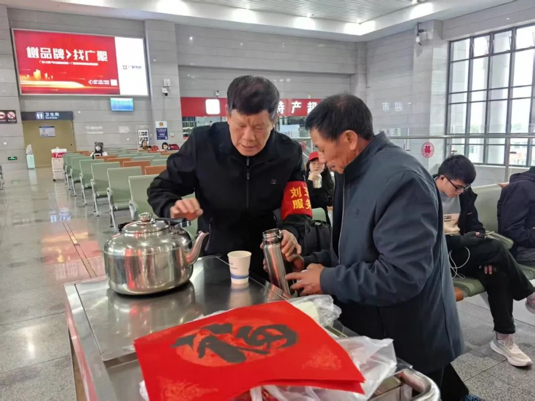 2025年春运期间,玉林站内人头攒动,客流如织。“来,喝一杯热开水,小心烫。”“这趟车在二楼候车,还有一个小时才开车,别着急。”……候车室内,“五老”刘玉生推着服务车穿梭在人群中。当旅客需要开水时,他细心接过水杯,拿起开水壶接满后,再小心递回;当旅客咨询问题时,他耐心解答,有时一句话反复说上好几遍,丝毫没有不耐烦……刘玉生细心周到的服务,一如既往。