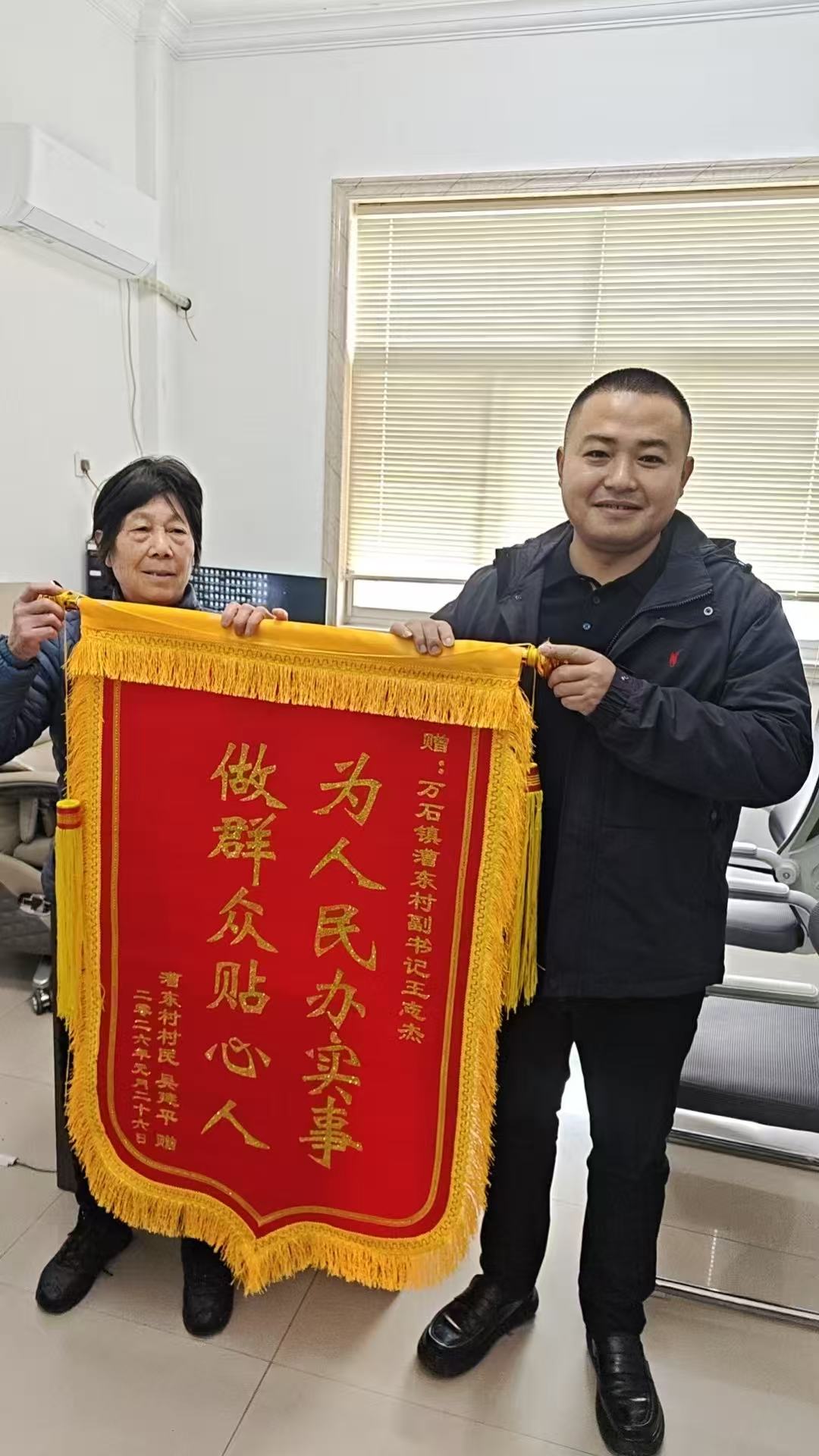 2026年春节前夕,宜兴市万石镇漕东村吴绛组78岁的承仁华老太来到了村委,给村党总支副书记王志杰送来了一面镌刻着“为人民办实事,做群众贴心人”12个黄色大字的锦旗,落款是“漕东村村民吴建平”。承老太拉着王志杰的手,激动地说:“本来我老头子要亲自送来,但他中风后腿脚不利索,平时要坐着轮椅才能周边活动,所以就让我把锦旗送来,表示我们的感激之情。”