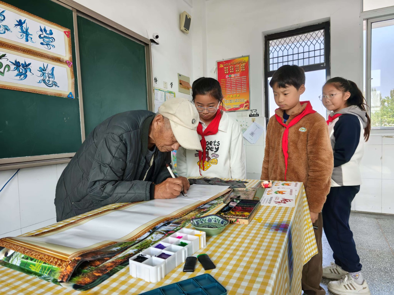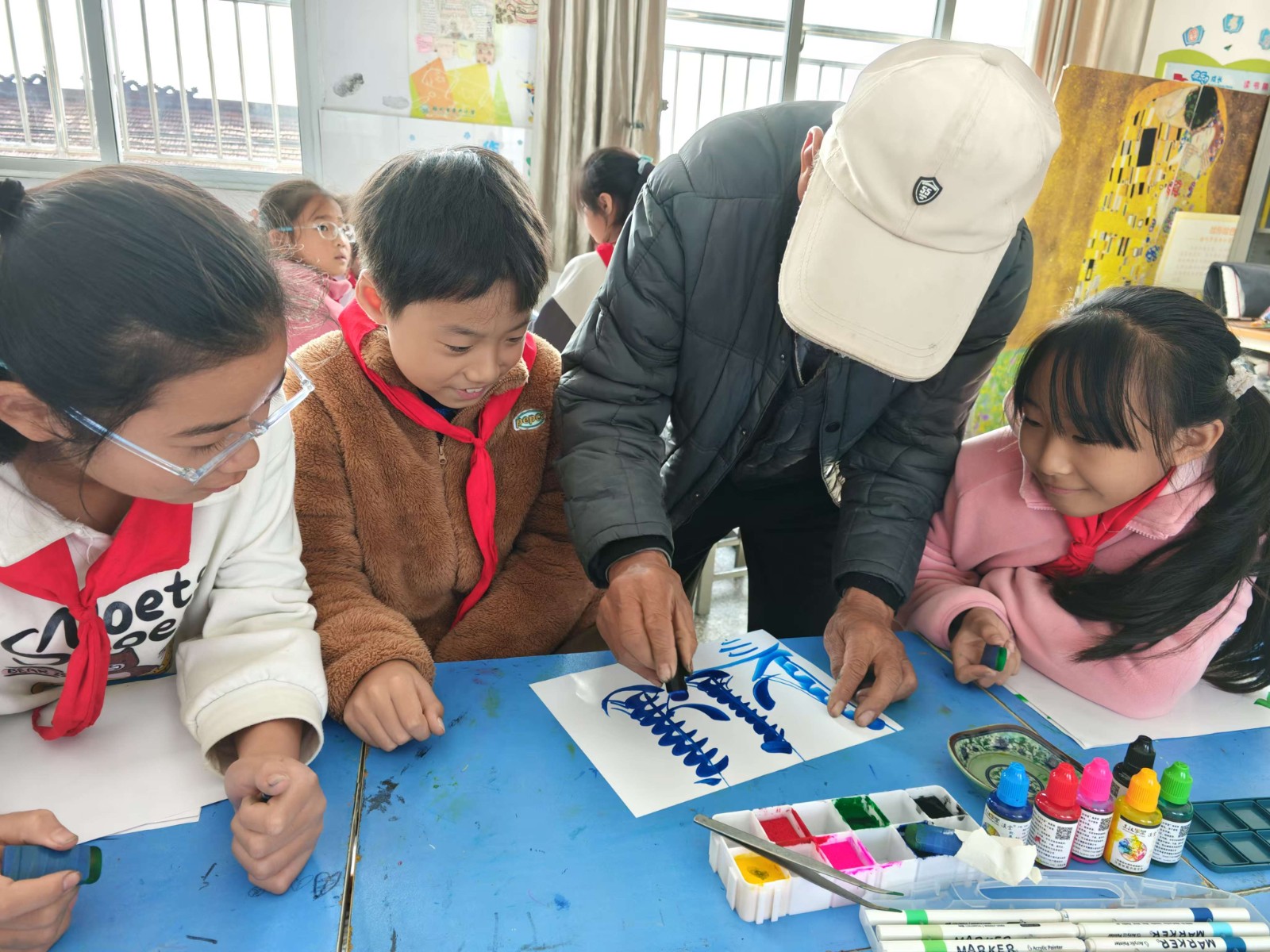 传承人张老不仅展示了花鸟字的技艺,还现场教授了学生们如何制作花鸟字。更耐心地指导学生们掌握画笔的运用技巧,如何调色、如何构图、如何运笔等。学生们在传承人的指导下,纷纷拿起画笔,尝试创作自己的花鸟字作品。虽然他们的技艺还不够娴熟,但那份对传统文化的热爱和传承的热情却令人感动。