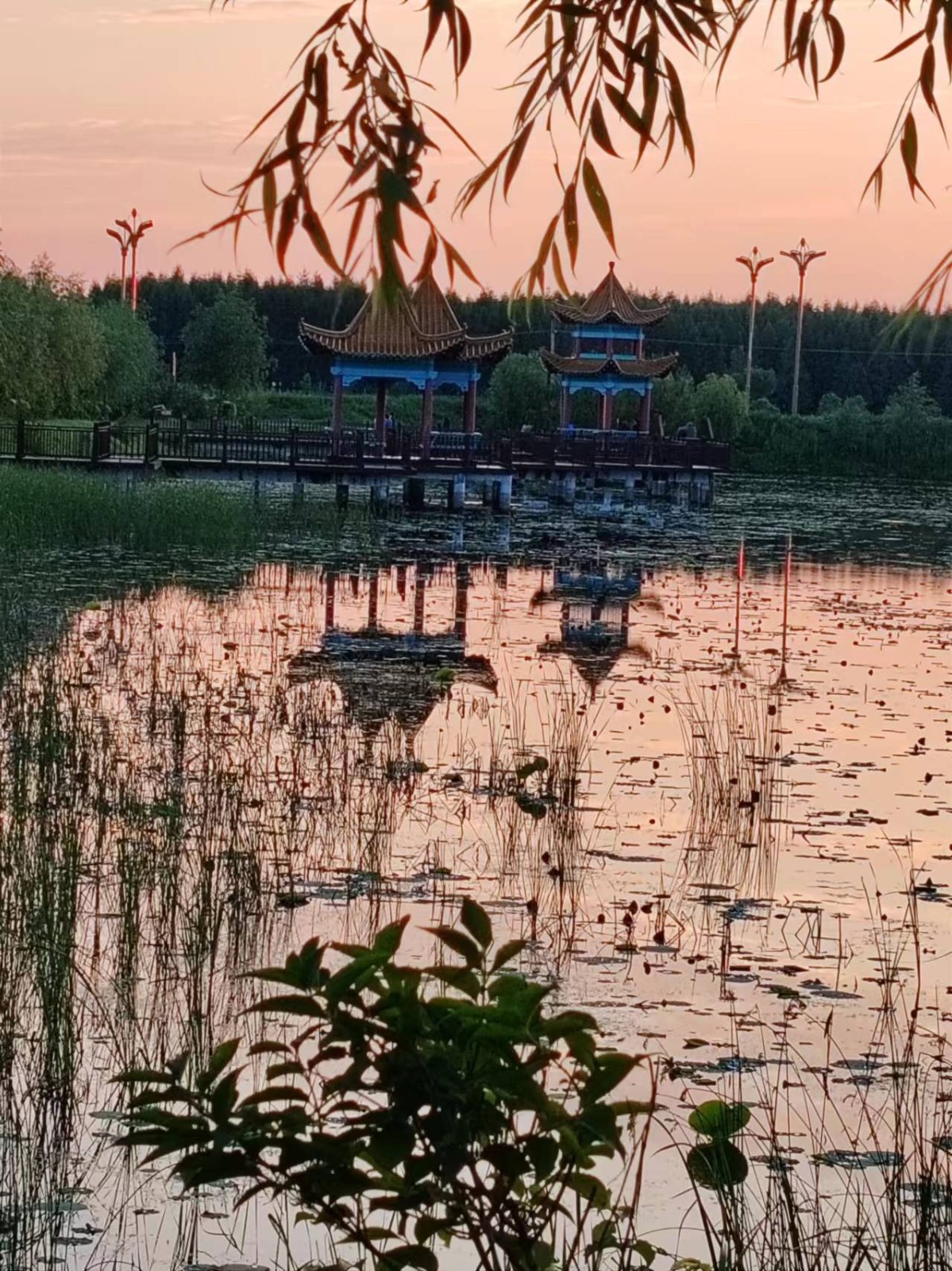 每当傍晚,我悄然走在寂静的桦树林中木板铺成的蜿蜒小路,背靠洁白的小桦树,呼吸着甜甜的有点清香味的空气,望着天空出神,眯着眼睛透过交错的枝桠缝间心旷神怡的来欣赏夏日那像少女的晚装一样,淡淡的、五光十色的晚霞。