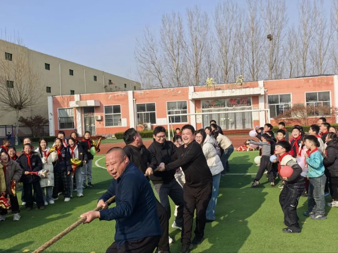 “一二!加油!一二!必胜!”整齐嘹亮的号子声在校园里回荡,师生拔河比赛将活动氛围推向顶峰!21名教师对阵24名高年级学生,双方队员紧握长绳,奋力拉扯。教师队沉稳有力,步步为营;学生队轻快敏捷,不甘示弱。呐喊声、加油声、助威声响彻校园。这根粗粗的拔河绳,系起了师生间的同心聚力,也系住了对新年的无限憧憬与美好期盼。
