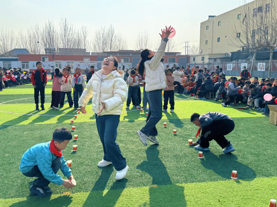 “气球别掉!杯子翻过来啦!”高年级的“抛球翻杯”挑战区气氛紧张又欢乐。抛起轻盈的气球、迅速翻转纸杯……一连串动作流畅如舞。气球飘飘、杯子立立,孩子们全神贯注,师生默契配合,在这跃动的一抛一接中,传递的是师生协作的智慧与迎新的喜悦。
