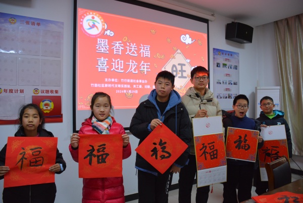 在春节即将来临之际,为弘扬中华优秀传统文化,丰富辖区居民精神文化生活,竹韵社区新时代文明实践站、关工委、妇联、团委联合开展“墨香送福 喜迎龙年”活动。由社区书法爱好者陆耀平带领孩子们一起写福字,并给孩子们分发斗方红纸、挂历,孩子们个个端坐,一丝不苟地书写出属于自己的新年福字。