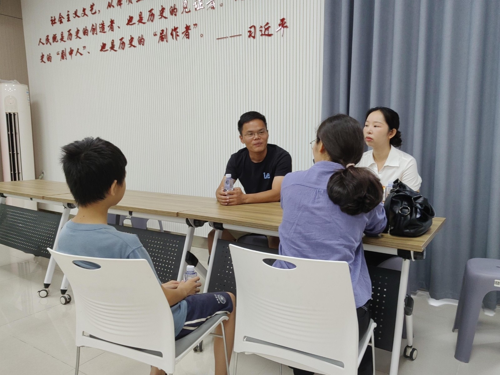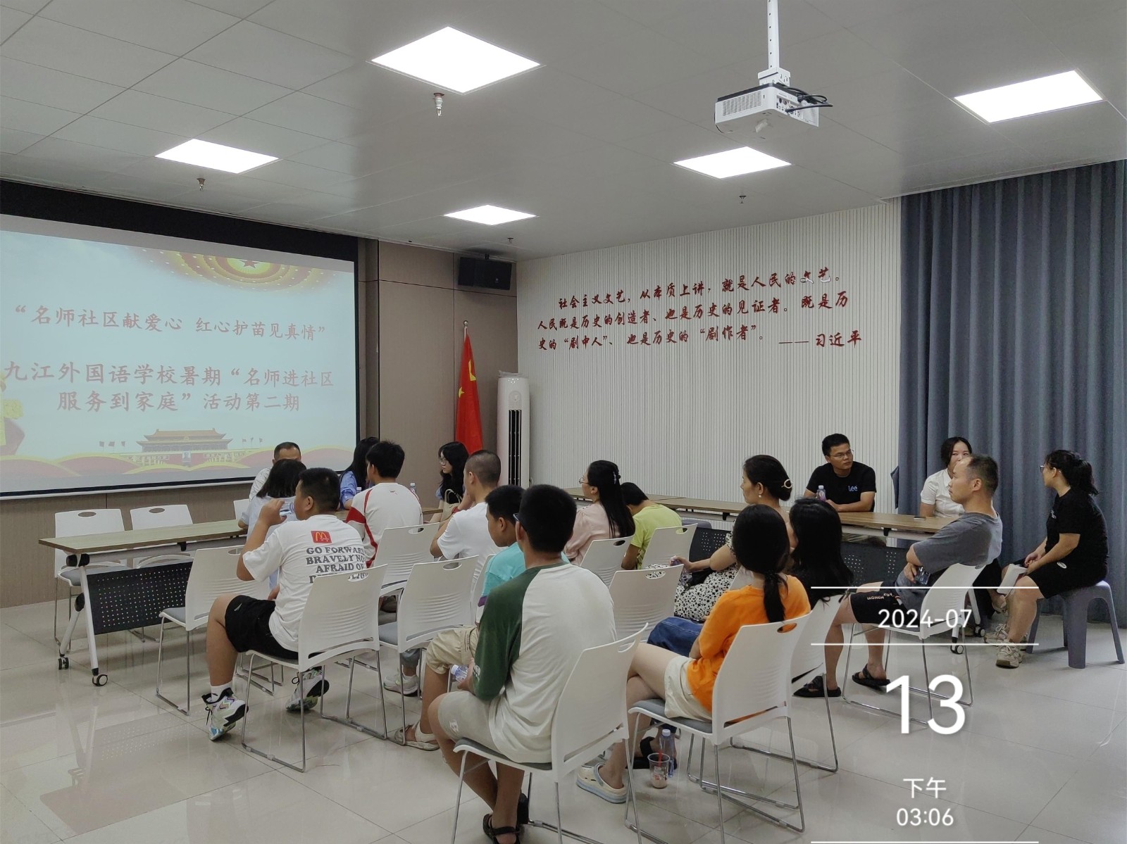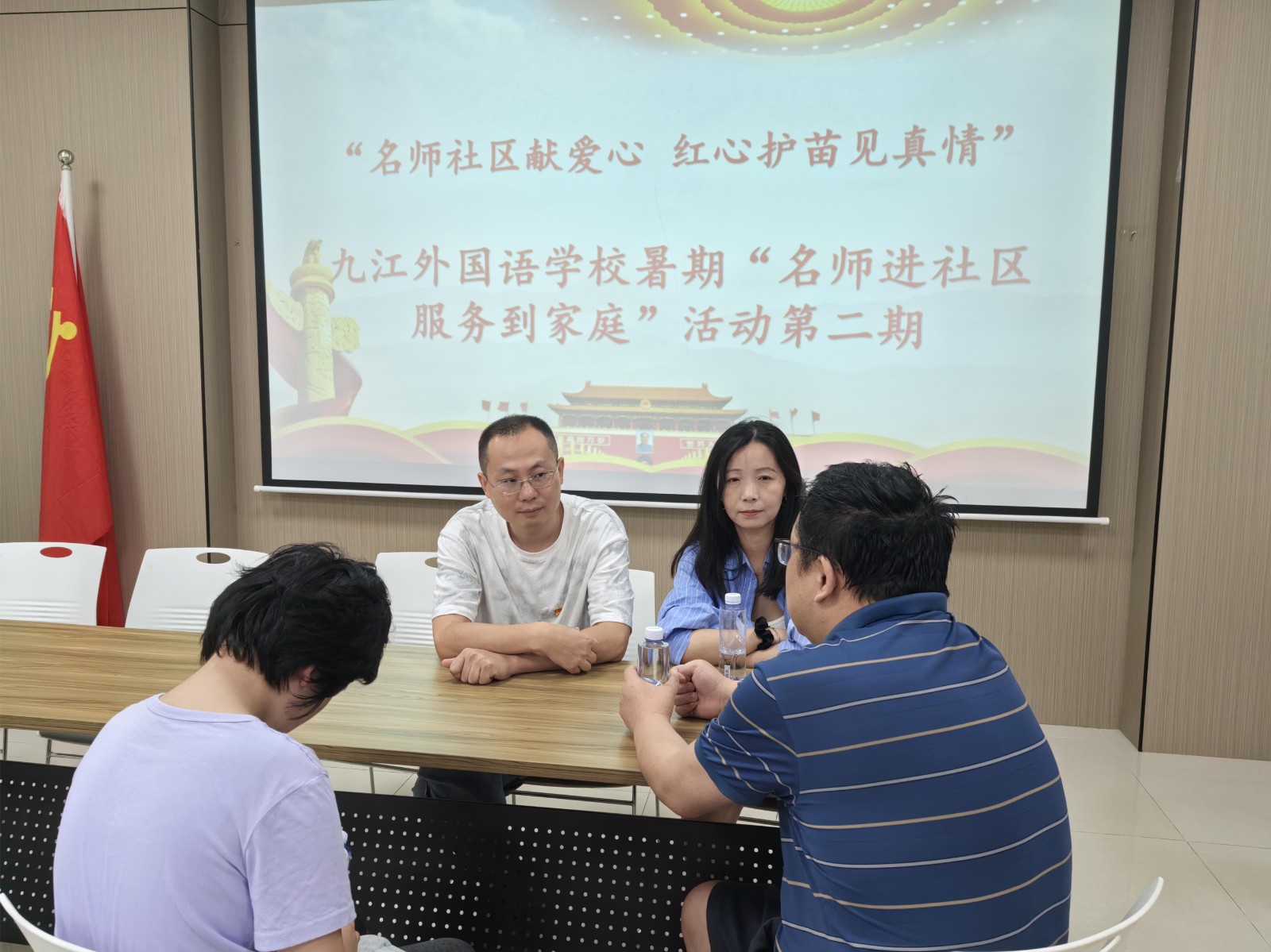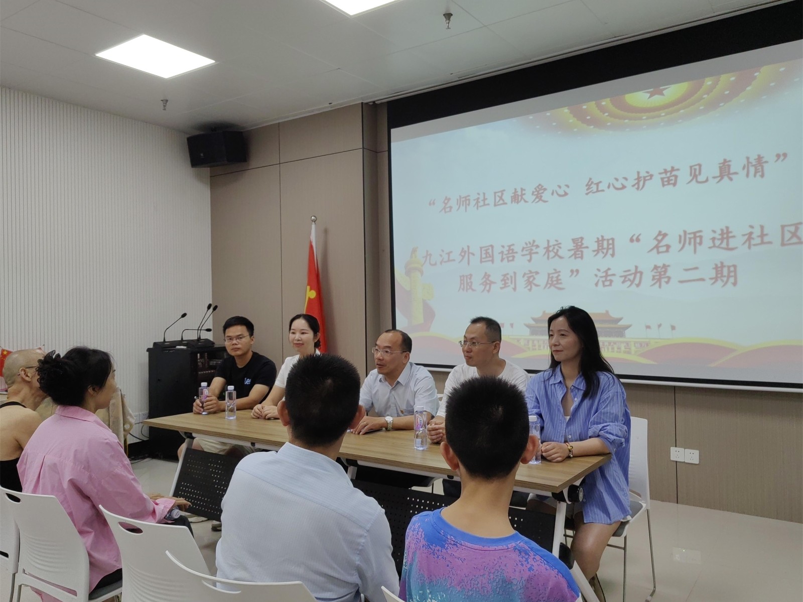 7月15日,九江外国语学校政教处主任代晴带领优秀教师赵文斌、饶琪、张细鹏老师顶着高温酷暑,走进九江市八里湖新区畔湖社区开展“名师进社区,服务到家庭”活动,与家长、学生们坐在一起,面对面传经授道,持续激发家校社协同育人新动能。这已经是该校第二次到畔湖社区开展类似活动。