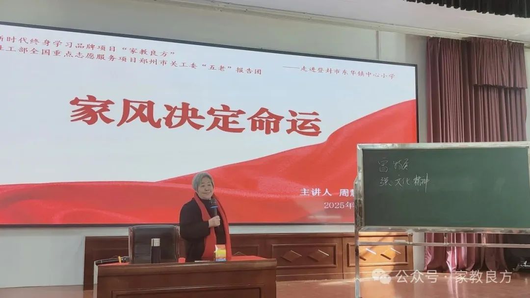 2025年2月8日下午,家教良方发起人周慧玲走进了登封市东华镇中心小学,为大家带来一场“家风决定命运”的主题的精彩报告。讲座伊始,周老师以“幸福人生三件事——干好工作、过好日子、养好孩子”为切入点,深入浅出地阐述了家庭教育在孩子成长过程中的关键作用。