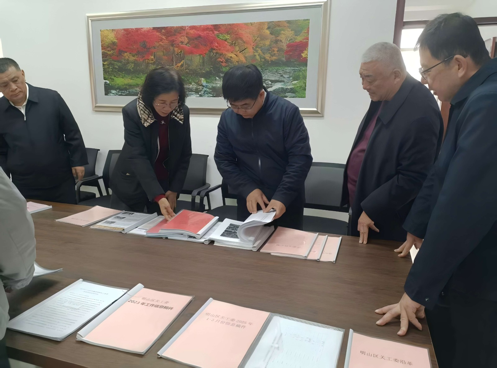 座谈会结束后,赵满主任在走进明山区关工委“五老”工作室,了解了明山区关工委组织建设、队伍建设和制度建设情况,认真翻阅了区关工委月、季度工作简报等档案资料。