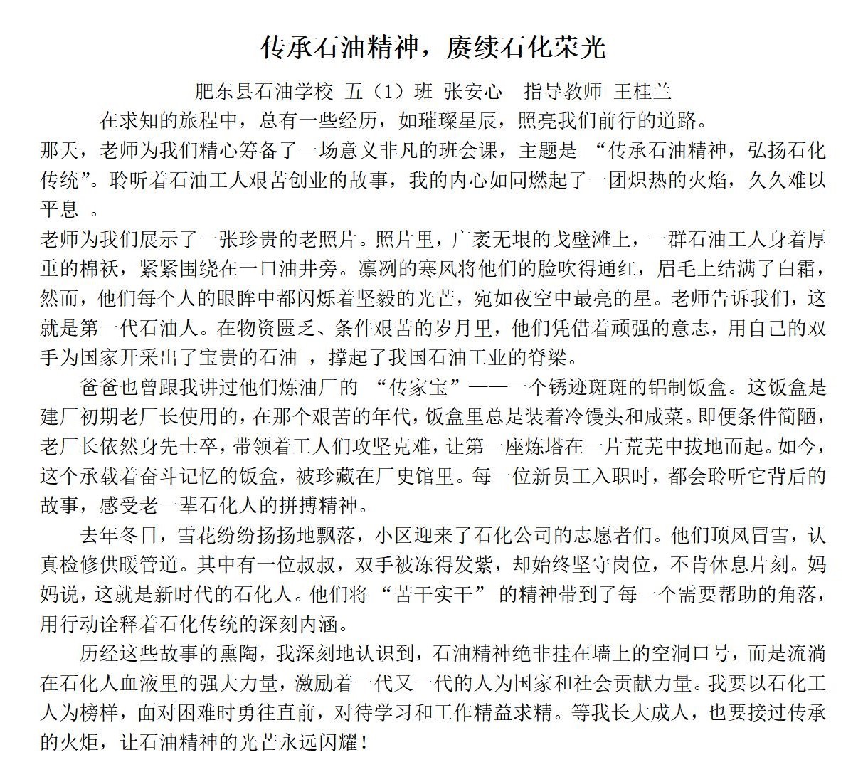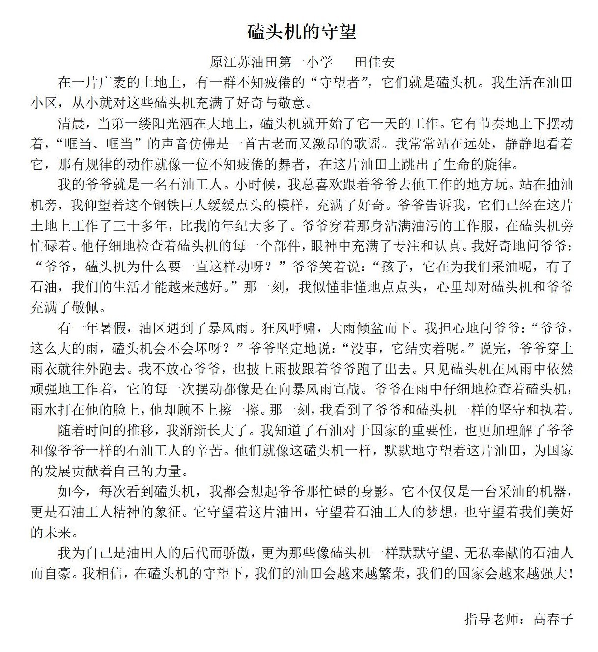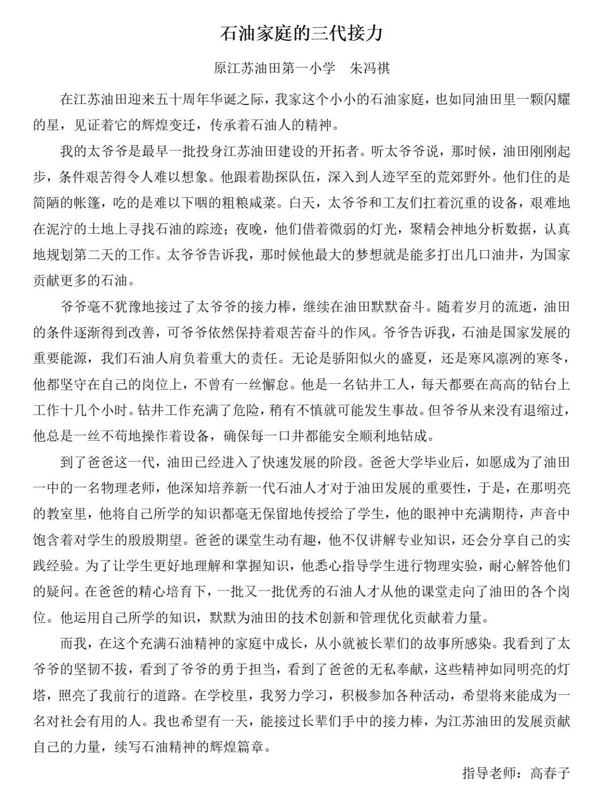 本次活动自启动以来,得到了众多“油二代”“油三代”以及受“油文化”熏陶的油区青少年积极响应和广泛参与。经过一个多月的精心准备和创作,共征集到作文34篇,绘画作品35篇。这些作品主题鲜明,内容丰富,形式多样,充分展现了油区青少年对江苏油田发展历程的深刻理解和对石油精神的独特感悟。