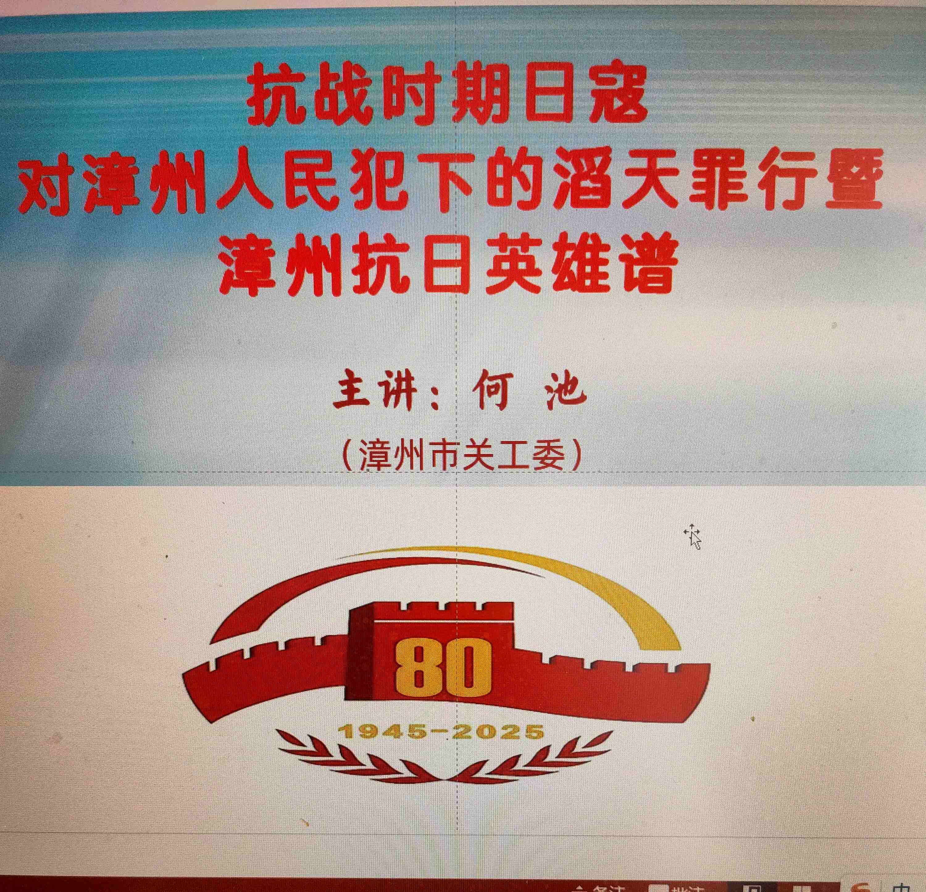 活动中,市关工委副主任何池为大家讲授《日寇飞机轰炸漳州的罪行暨漳州抗日英雄谱》的讲座。何主任在讲座中回溯,当日寇侵占厦门后,为加速侵略进程,多次对漳州实施轰炸,无数百姓的生命与财产在无情的战火中化为乌有,日军犯下的累累罪行令人痛心疾首;同时,也讲述了漳州军民奋起反抗的英勇事迹,面对日军妄图侵占诏安、东山、海澄,并进一步染指漳州、泉州的野心,漳州军民毫不畏惧、浴血奋战,首战便击沉日舰“箬竹号”,用热血和生命捍卫了家园,谱写了一曲气壮山河的抗战赞歌 。